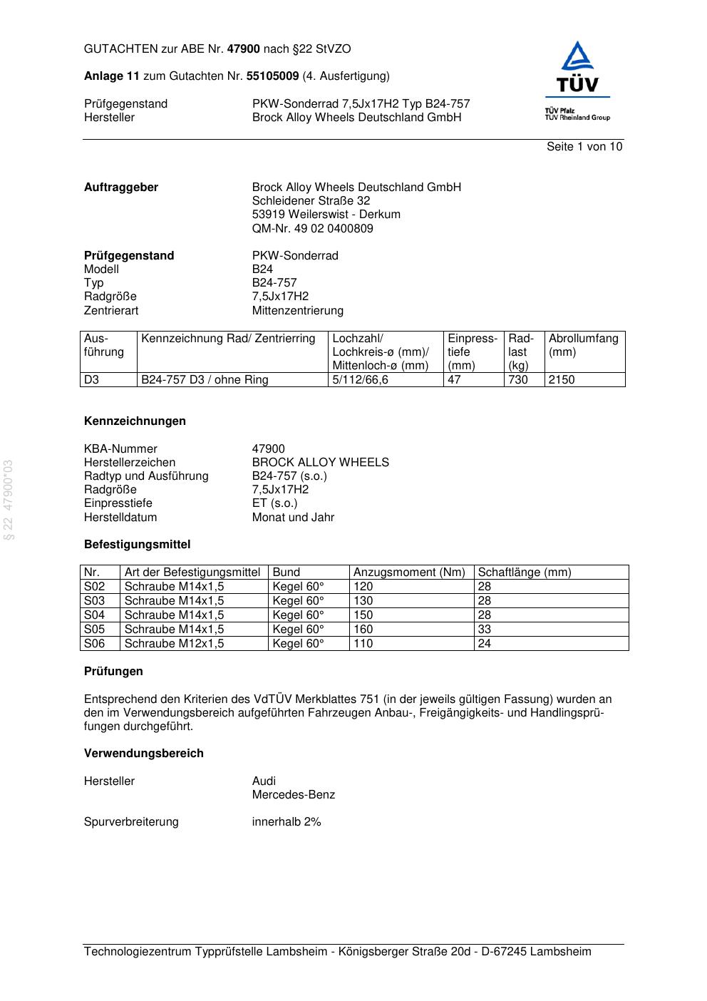 Dieses Gutachten (abe) bezieht sich auf die Alufelge Brock B24-757 in der Ausführung 7.5Jx17 ET 0, Mittenloch 0 mm (KBA 47900). Im PDF findest du typischerweise zulässige Reifengrößen, Auflagen/Anbauhinweise und – je nach Dokument – Hinweise zur Eintragung.