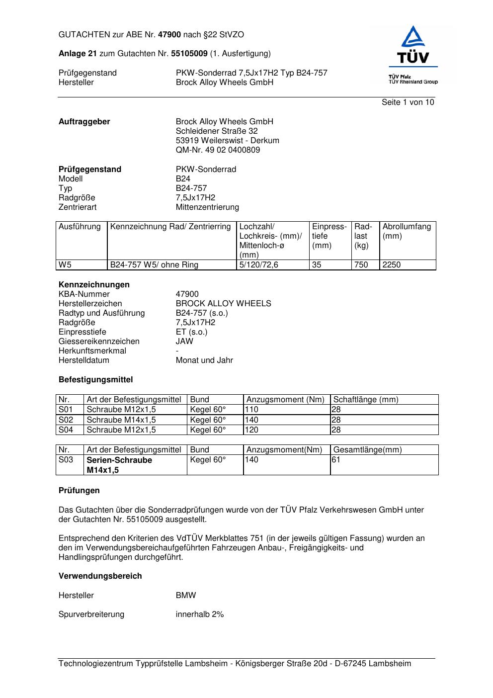 Dieses Gutachten (abe) bezieht sich auf die Alufelge Brock B24-757 in der Ausführung 7.5Jx17 ET 0, Mittenloch 0 mm (KBA 47900). Im PDF findest du typischerweise zulässige Reifengrößen, Auflagen/Anbauhinweise und – je nach Dokument – Hinweise zur Eintragung.