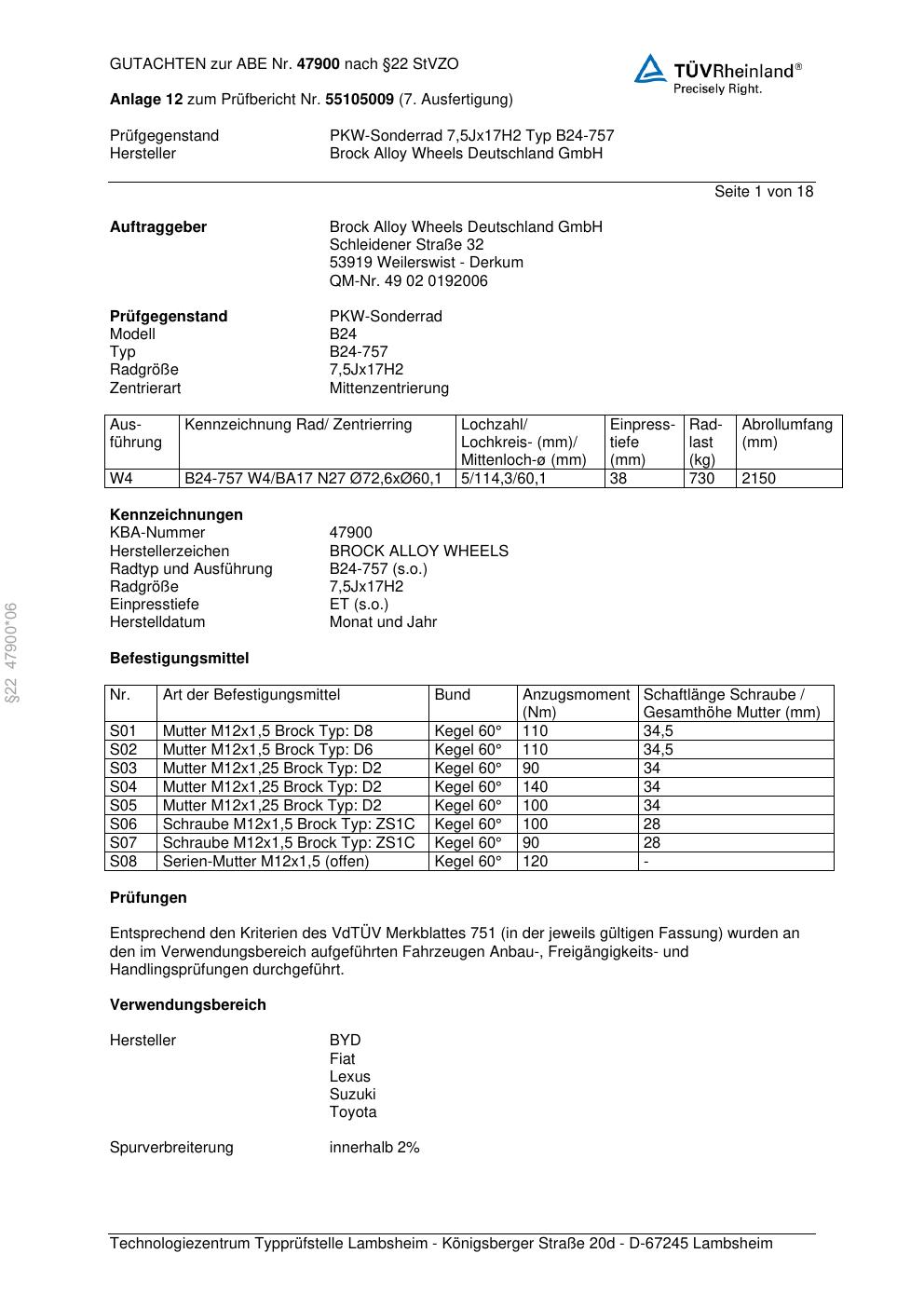 Dieses Gutachten (abe) bezieht sich auf die Alufelge Brock B24-757 in der Ausführung 7.5Jx17 ET 0, Mittenloch 0 mm (KBA 47900). Im PDF findest du typischerweise zulässige Reifengrößen, Auflagen/Anbauhinweise und – je nach Dokument – Hinweise zur Eintragung.
