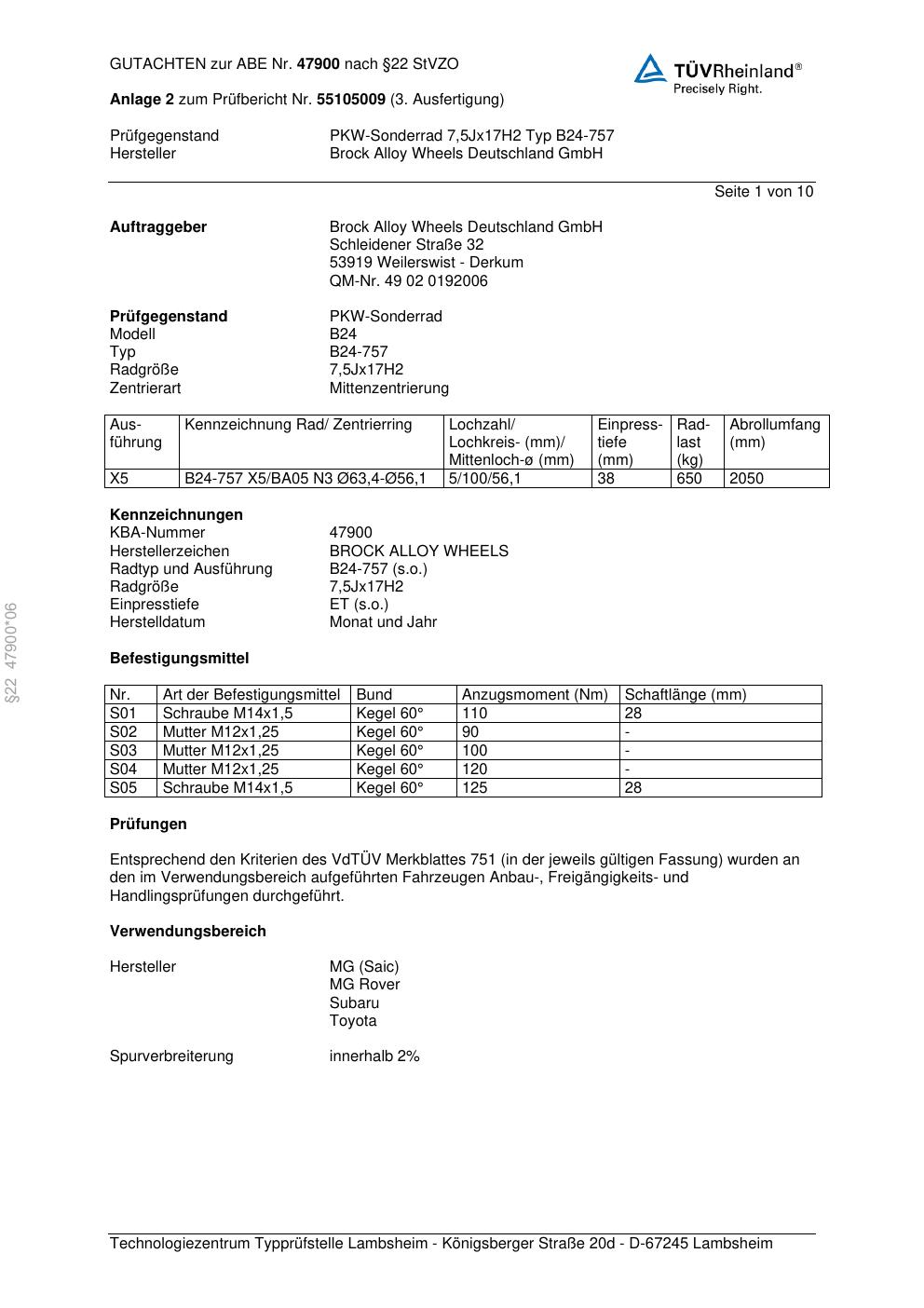 Dieses Gutachten (abe) bezieht sich auf die Alufelge Brock B24-757 in der Ausführung 7.5Jx17 ET 0, Mittenloch 0 mm (KBA 47900). Im PDF findest du typischerweise zulässige Reifengrößen, Auflagen/Anbauhinweise und – je nach Dokument – Hinweise zur Eintragung.