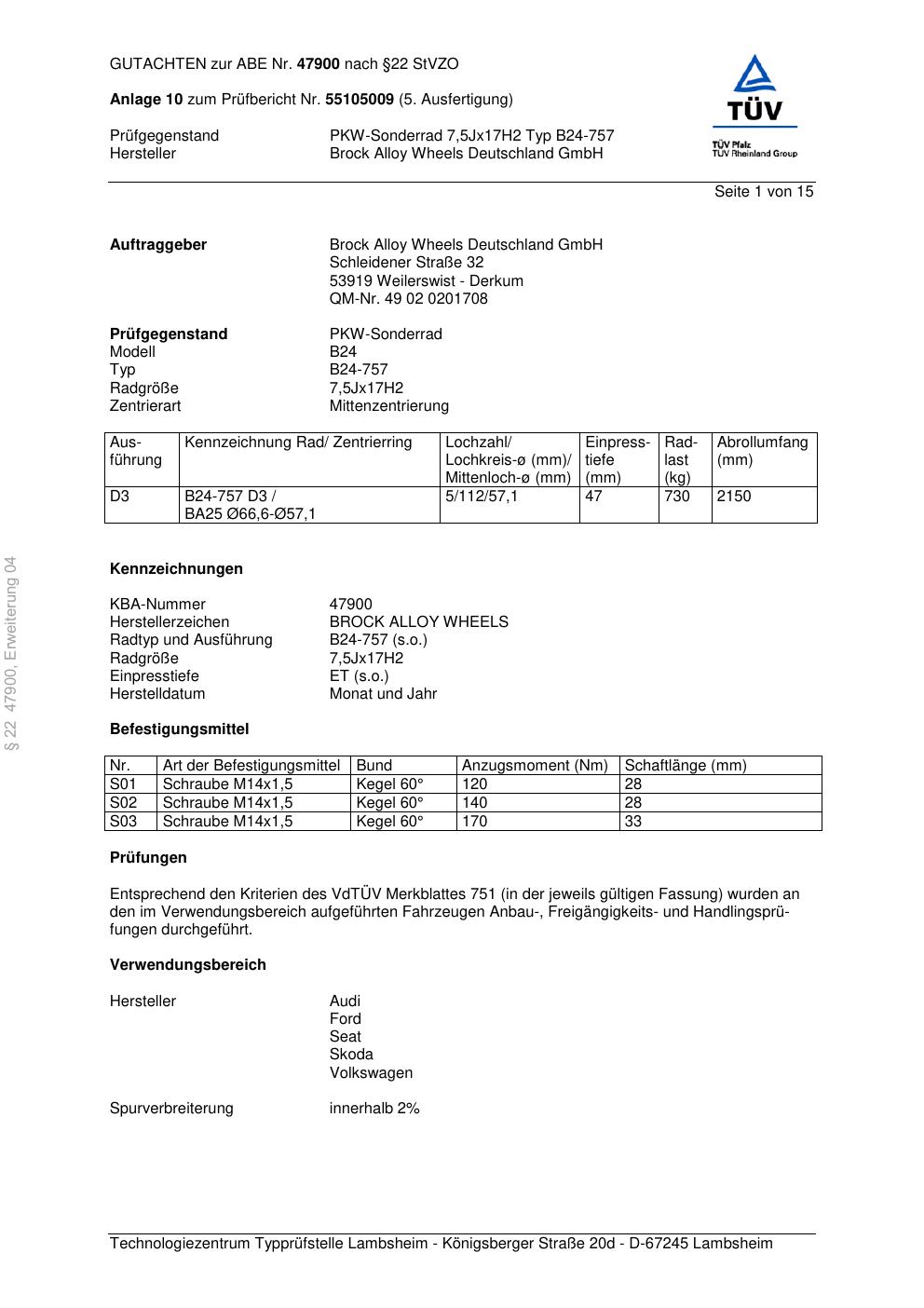 Dieses Gutachten (abe) bezieht sich auf die Alufelge Brock B24-757 in der Ausführung 7.5Jx17 ET 0, Mittenloch 0 mm (KBA 47900). Im PDF findest du typischerweise zulässige Reifengrößen, Auflagen/Anbauhinweise und – je nach Dokument – Hinweise zur Eintragung.