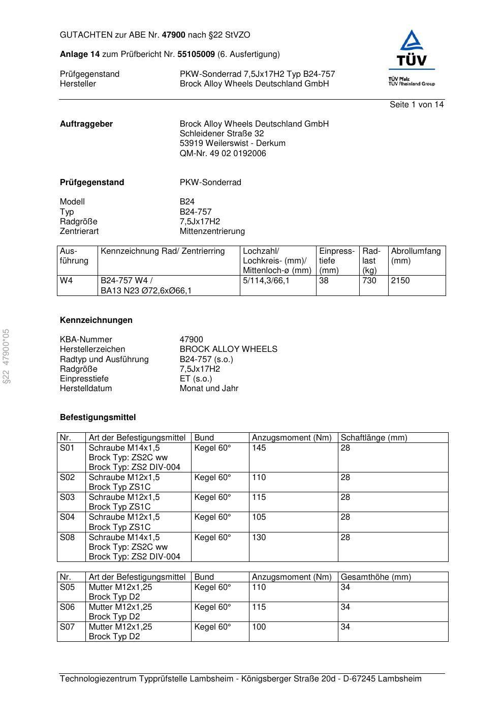 Dieses Gutachten (abe) bezieht sich auf die Alufelge Brock B24-757 in der Ausführung 7.5Jx17 ET 0, Mittenloch 0 mm (KBA 47900). Im PDF findest du typischerweise zulässige Reifengrößen, Auflagen/Anbauhinweise und – je nach Dokument – Hinweise zur Eintragung.