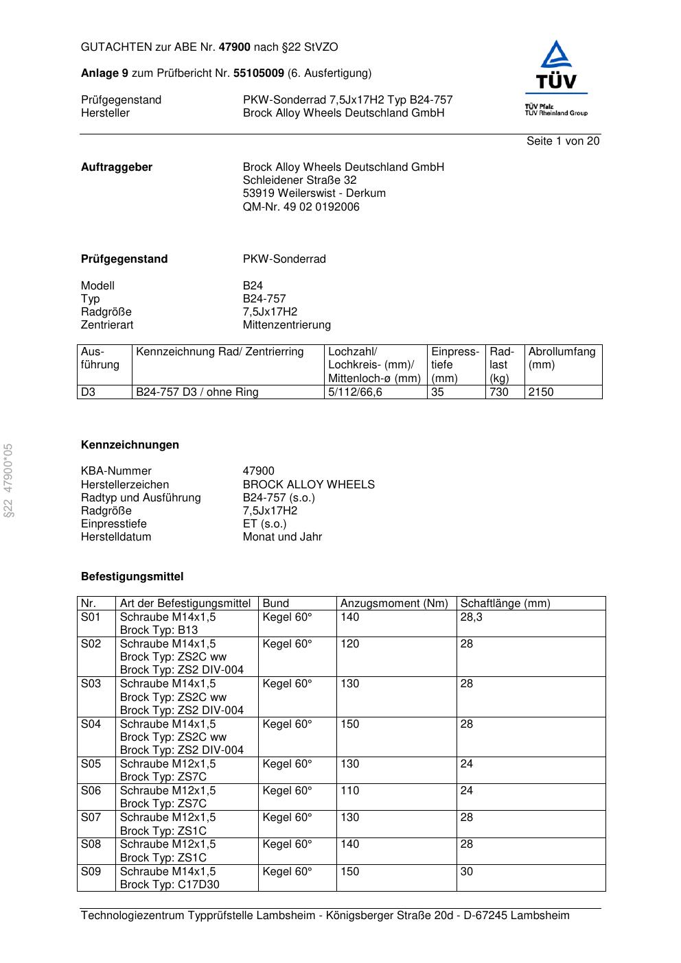 Dieses Gutachten (abe) bezieht sich auf die Alufelge Brock B24-757 in der Ausführung 7.5Jx17 ET 0, Mittenloch 0 mm (KBA 47900). Im PDF findest du typischerweise zulässige Reifengrößen, Auflagen/Anbauhinweise und – je nach Dokument – Hinweise zur Eintragung.