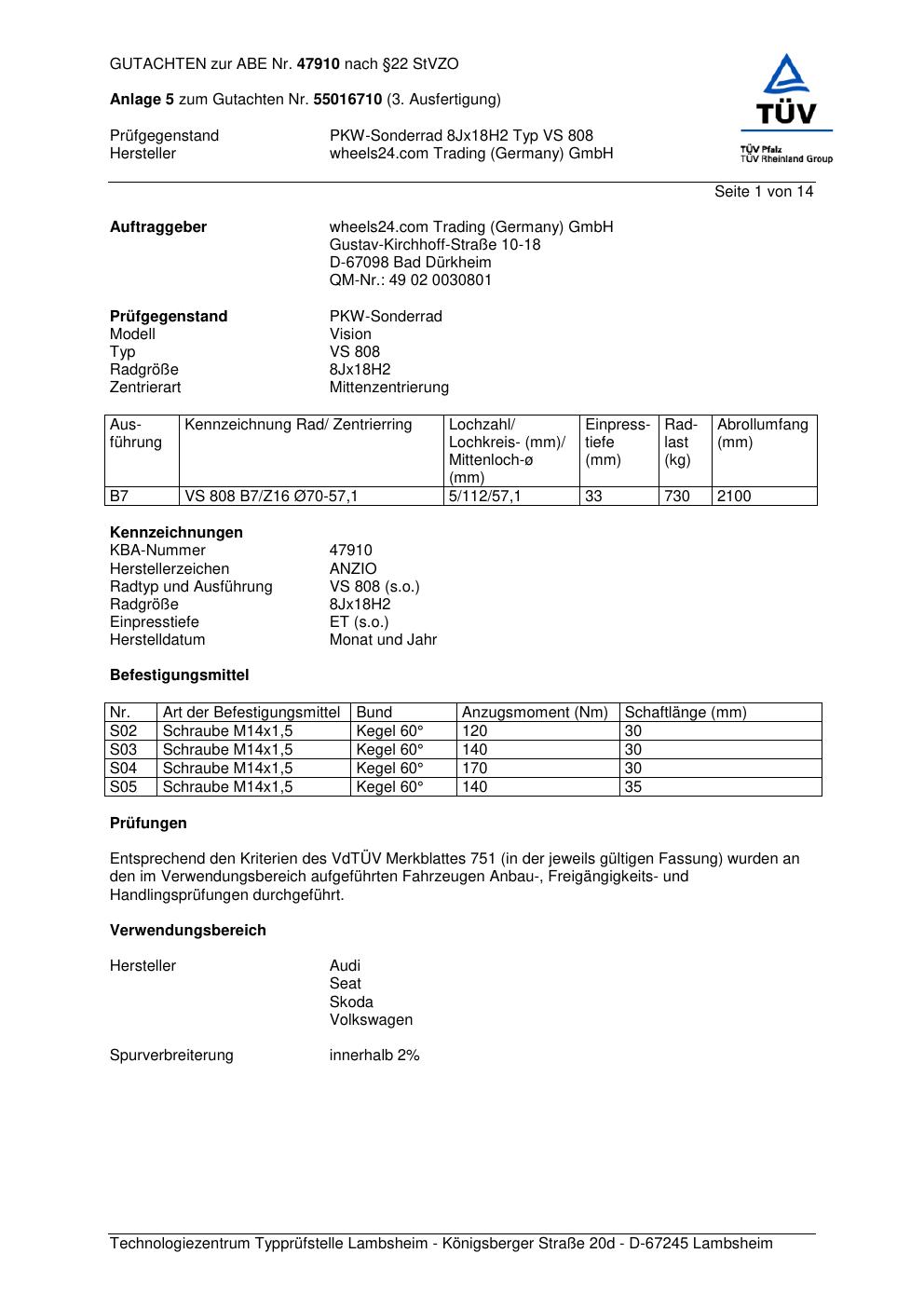Dieses Gutachten (abe) bezieht sich auf die Alufelge Anzio VS 808 in der Ausführung 8Jx18 ET 0, Mittenloch 0 mm (KBA 47910). Im PDF findest du typischerweise zulässige Reifengrößen, Auflagen/Anbauhinweise und – je nach Dokument – Hinweise zur Eintragung.