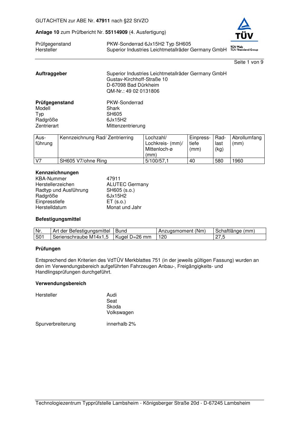 Dieses Gutachten (abe) bezieht sich auf die Alufelge ALUTEC SH605 in der Ausführung 6Jx15 ET 0, Mittenloch 0 mm (KBA 47911). Im PDF findest du typischerweise zulässige Reifengrößen, Auflagen/Anbauhinweise und – je nach Dokument – Hinweise zur Eintragung.