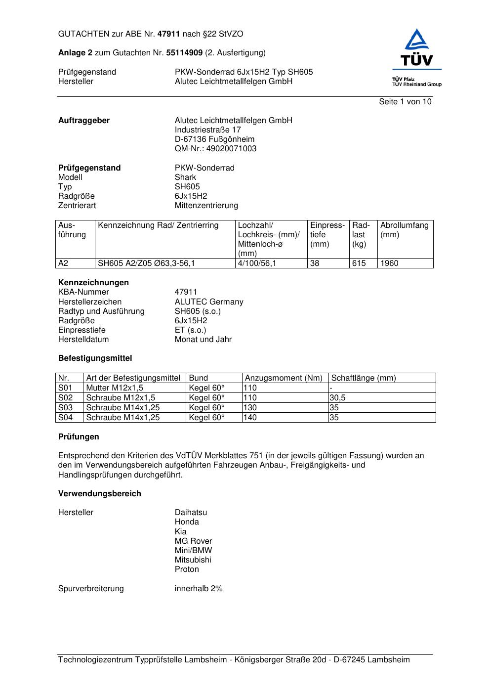 Dieses Gutachten (abe) bezieht sich auf die Alufelge ALUTEC SH605 in der Ausführung 6Jx15 ET 0, Mittenloch 0 mm (KBA 47911). Im PDF findest du typischerweise zulässige Reifengrößen, Auflagen/Anbauhinweise und – je nach Dokument – Hinweise zur Eintragung.