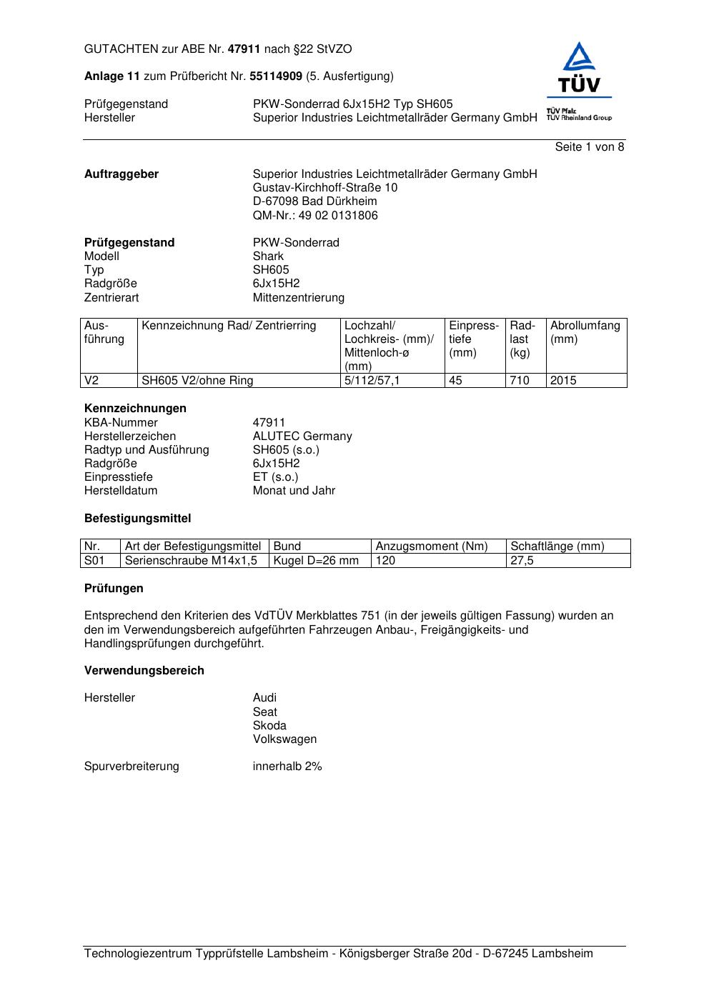 Dieses Gutachten (abe) bezieht sich auf die Alufelge ALUTEC SH605 in der Ausführung 6Jx15 ET 0, Mittenloch 0 mm (KBA 47911). Im PDF findest du typischerweise zulässige Reifengrößen, Auflagen/Anbauhinweise und – je nach Dokument – Hinweise zur Eintragung.