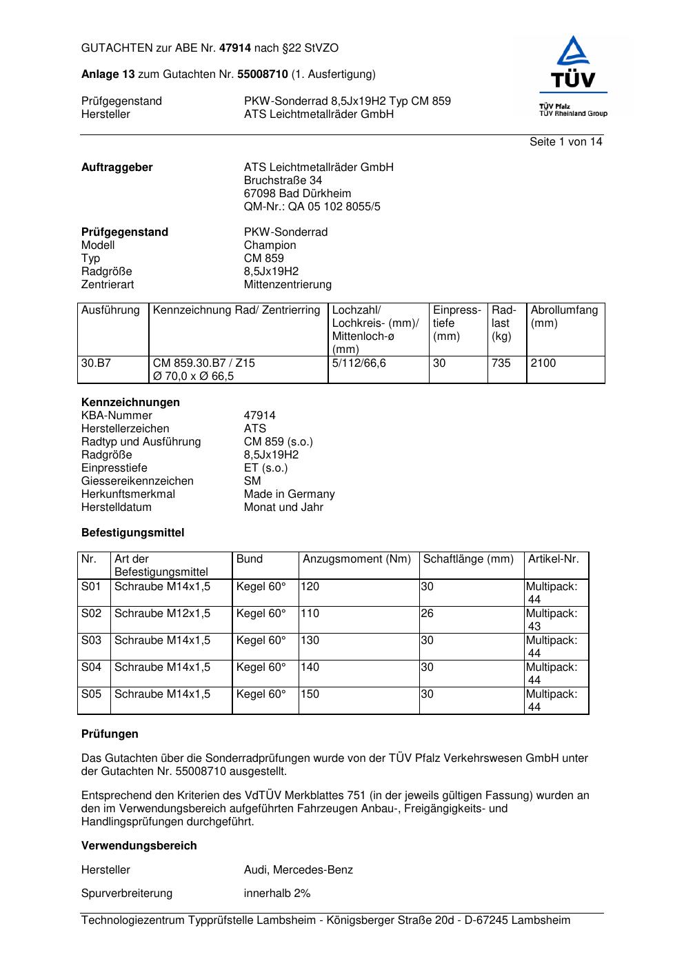 Dieses Gutachten (abe) bezieht sich auf die Alufelge ATS CM 859 in der Ausführung 8.5Jx19 ET 0, Mittenloch 0 mm (KBA 47914). Im PDF findest du typischerweise zulässige Reifengrößen, Auflagen/Anbauhinweise und – je nach Dokument – Hinweise zur Eintragung.