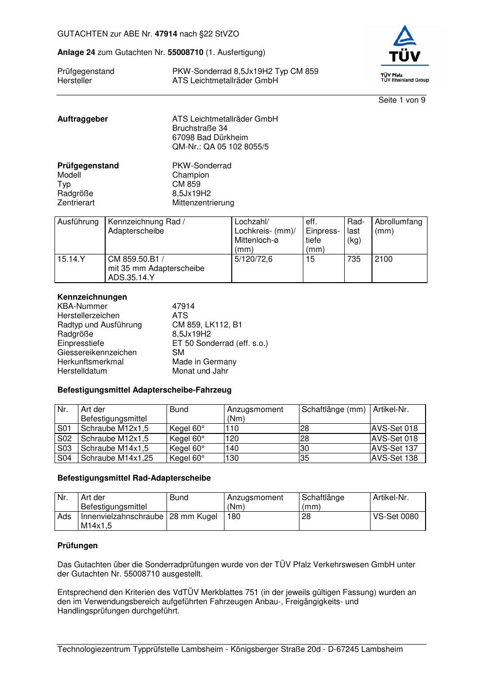 Dieses Gutachten (abe) bezieht sich auf die Alufelge ATS CM 859 in der Ausführung 8.5Jx19 ET 0, Mittenloch 0 mm (KBA 47914). Im PDF findest du typischerweise zulässige Reifengrößen, Auflagen/Anbauhinweise und – je nach Dokument – Hinweise zur Eintragung.