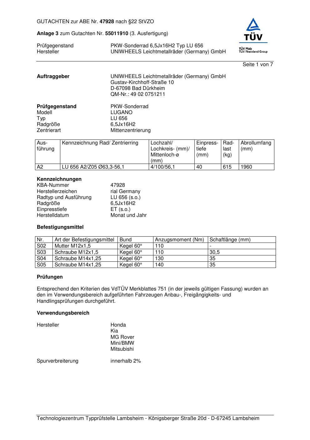 Dieses Gutachten (abe) bezieht sich auf die Alufelge brand-rial LU 656 in der Ausführung 6.5Jx16 ET 0, Mittenloch 0 mm (KBA 47928). Im PDF findest du typischerweise zulässige Reifengrößen, Auflagen/Anbauhinweise und – je nach Dokument – Hinweise zur Eintragung.
