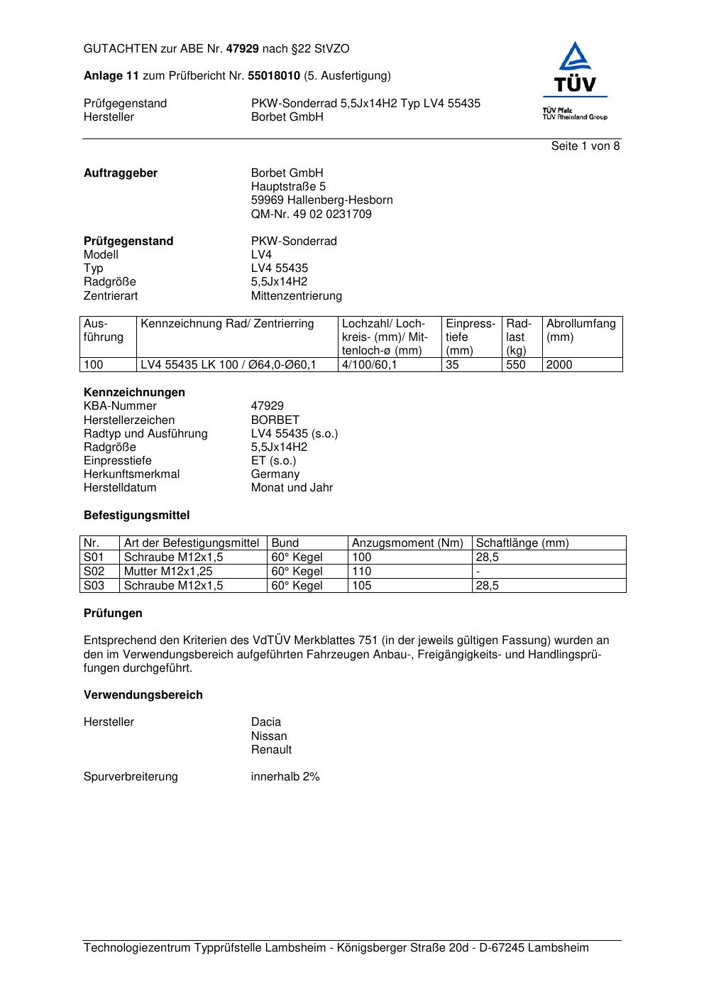 Dieses Gutachten (abe) bezieht sich auf die Alufelge Borbet LV4 5543 5 in der Ausführung 5.5Jx14 ET 0, Mittenloch 0 mm (KBA 47929). Im PDF findest du typischerweise zulässige Reifengrößen, Auflagen/Anbauhinweise und – je nach Dokument – Hinweise zur Eintragung.