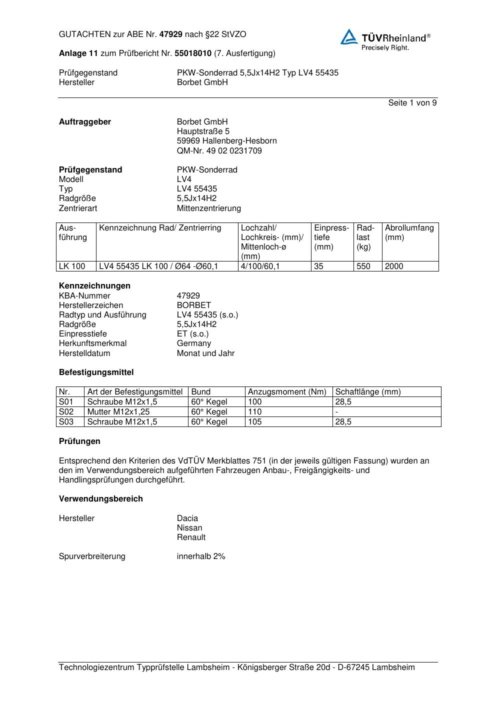 Dieses Gutachten (abe) bezieht sich auf die Alufelge Borbet LV4 5543 5 in der Ausführung 5.5Jx14 ET 0, Mittenloch 0 mm (KBA 47929). Im PDF findest du typischerweise zulässige Reifengrößen, Auflagen/Anbauhinweise und – je nach Dokument – Hinweise zur Eintragung.