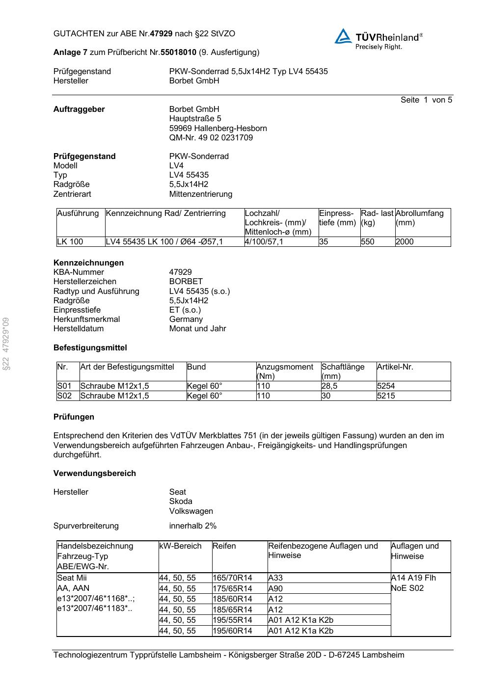 Dieses Gutachten (abe) bezieht sich auf die Alufelge Borbet LV4 55435 in der Ausführung 5.5Jx14 ET 0, Mittenloch 0 mm (KBA 47929). Im PDF findest du typischerweise zulässige Reifengrößen, Auflagen/Anbauhinweise und – je nach Dokument – Hinweise zur Eintragung.