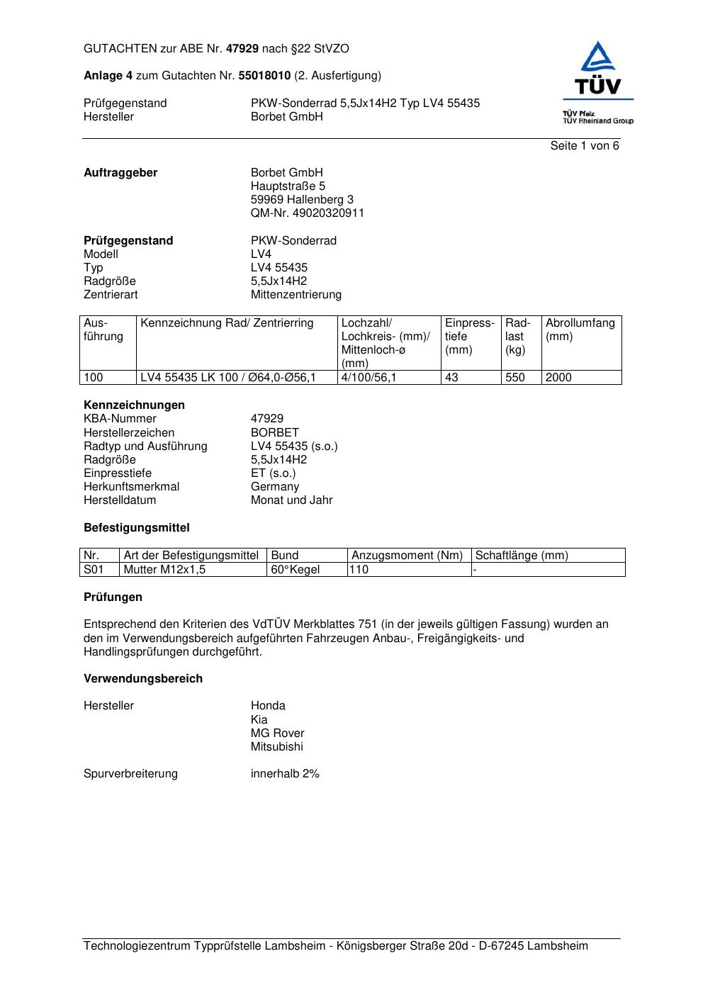 Dieses Gutachten (abe) bezieht sich auf die Alufelge Borbet LV4 55435 in der Ausführung 5.5Jx14 ET 0, Mittenloch 0 mm (KBA 47929). Im PDF findest du typischerweise zulässige Reifengrößen, Auflagen/Anbauhinweise und – je nach Dokument – Hinweise zur Eintragung.