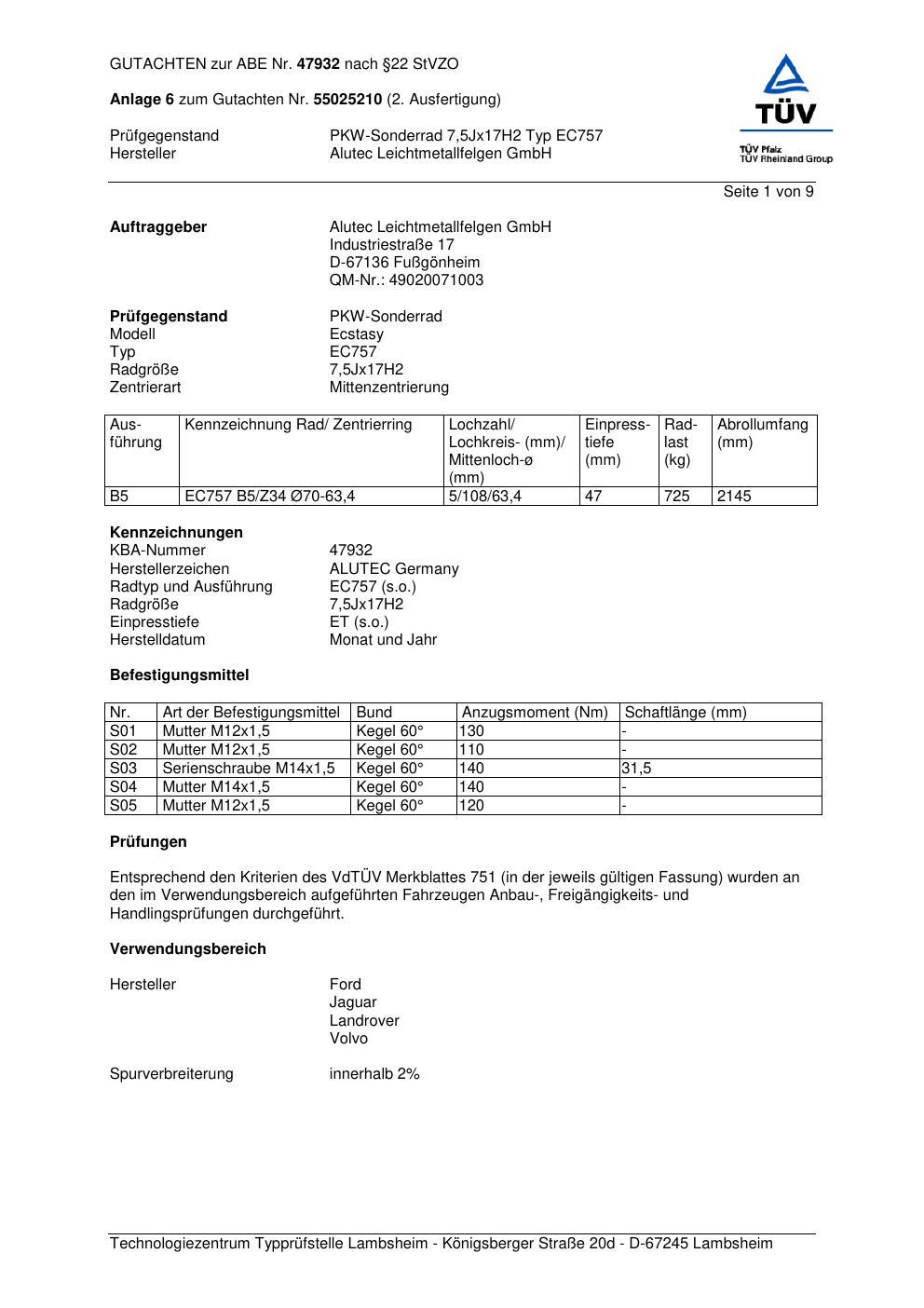 Dieses Gutachten (abe) bezieht sich auf die Alufelge ALUTEC EC757 in der Ausführung 7.5Jx17 ET 0, Mittenloch 0 mm (KBA 47932). Im PDF findest du typischerweise zulässige Reifengrößen, Auflagen/Anbauhinweise und – je nach Dokument – Hinweise zur Eintragung.