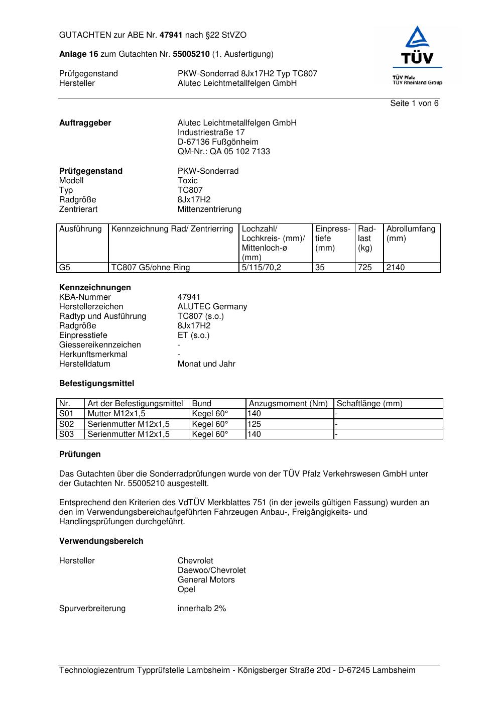 Dieses Gutachten (abe) bezieht sich auf die Alufelge ALUTEC TC807 in der Ausführung 8Jx17 ET 0, Mittenloch 0 mm (KBA 47941). Im PDF findest du typischerweise zulässige Reifengrößen, Auflagen/Anbauhinweise und – je nach Dokument – Hinweise zur Eintragung.