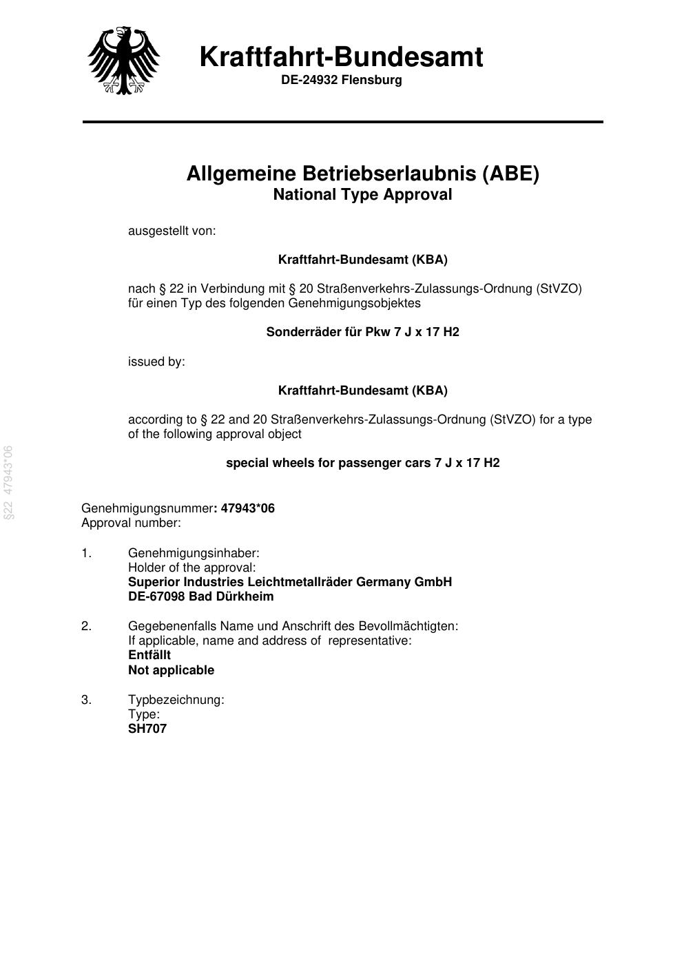 Dieses Gutachten (abe) bezieht sich auf die Alufelge ALUTEC e Approval in der Ausführung 7Jx17 ET 0, Mittenloch 0 mm (KBA 47943). Im PDF findest du typischerweise zulässige Reifengrößen, Auflagen/Anbauhinweise und – je nach Dokument – Hinweise zur Eintragung.