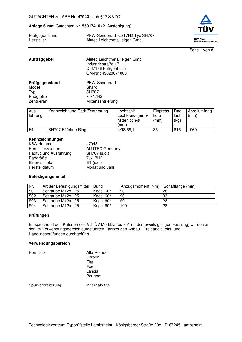 Dieses Gutachten (abe) bezieht sich auf die Alufelge ALUTEC SH707 in der Ausführung 7Jx17 ET 0, Mittenloch 0 mm (KBA 47943). Im PDF findest du typischerweise zulässige Reifengrößen, Auflagen/Anbauhinweise und – je nach Dokument – Hinweise zur Eintragung.