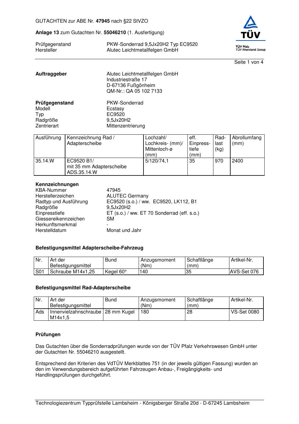 Dieses Gutachten (abe) bezieht sich auf die Alufelge ALUTEC EC9520 in der Ausführung 9.5Jx2 ET 0, Mittenloch 0 mm (KBA 47945). Im PDF findest du typischerweise zulässige Reifengrößen, Auflagen/Anbauhinweise und – je nach Dokument – Hinweise zur Eintragung.