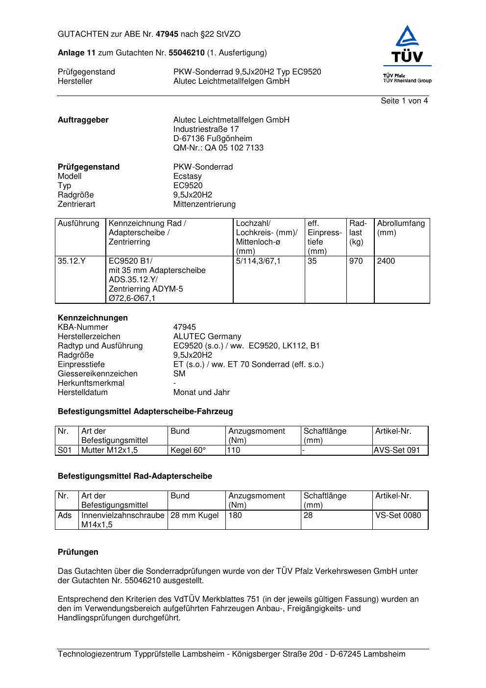 Dieses Gutachten (abe) bezieht sich auf die Alufelge ALUTEC EC9520 in der Ausführung 9.5Jx2 ET 0, Mittenloch 0 mm (KBA 47945). Im PDF findest du typischerweise zulässige Reifengrößen, Auflagen/Anbauhinweise und – je nach Dokument – Hinweise zur Eintragung.