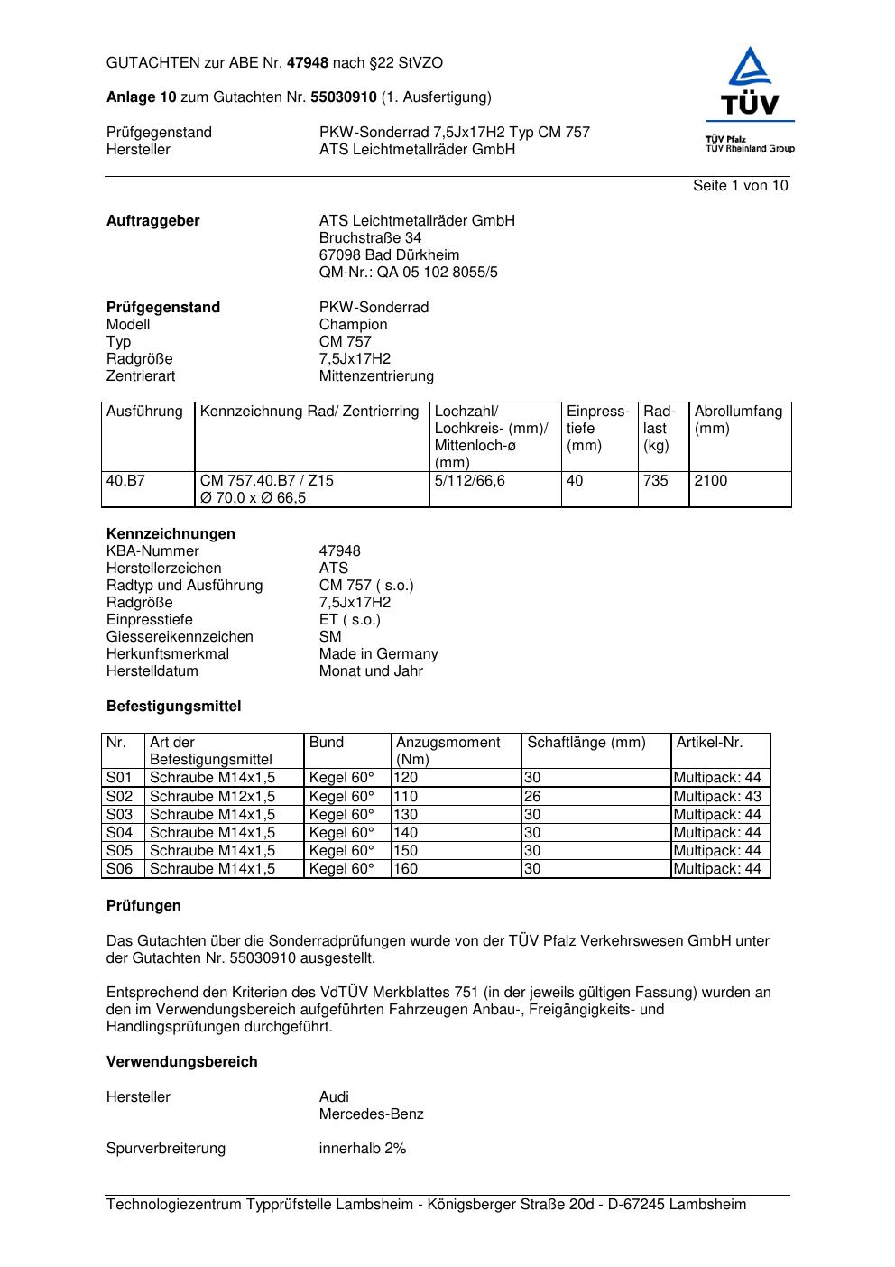 Dieses Gutachten (abe) bezieht sich auf die Alufelge ATS CM 757 in der Ausführung 7.5Jx17 ET 0, Mittenloch 0 mm (KBA 47948). Im PDF findest du typischerweise zulässige Reifengrößen, Auflagen/Anbauhinweise und – je nach Dokument – Hinweise zur Eintragung.