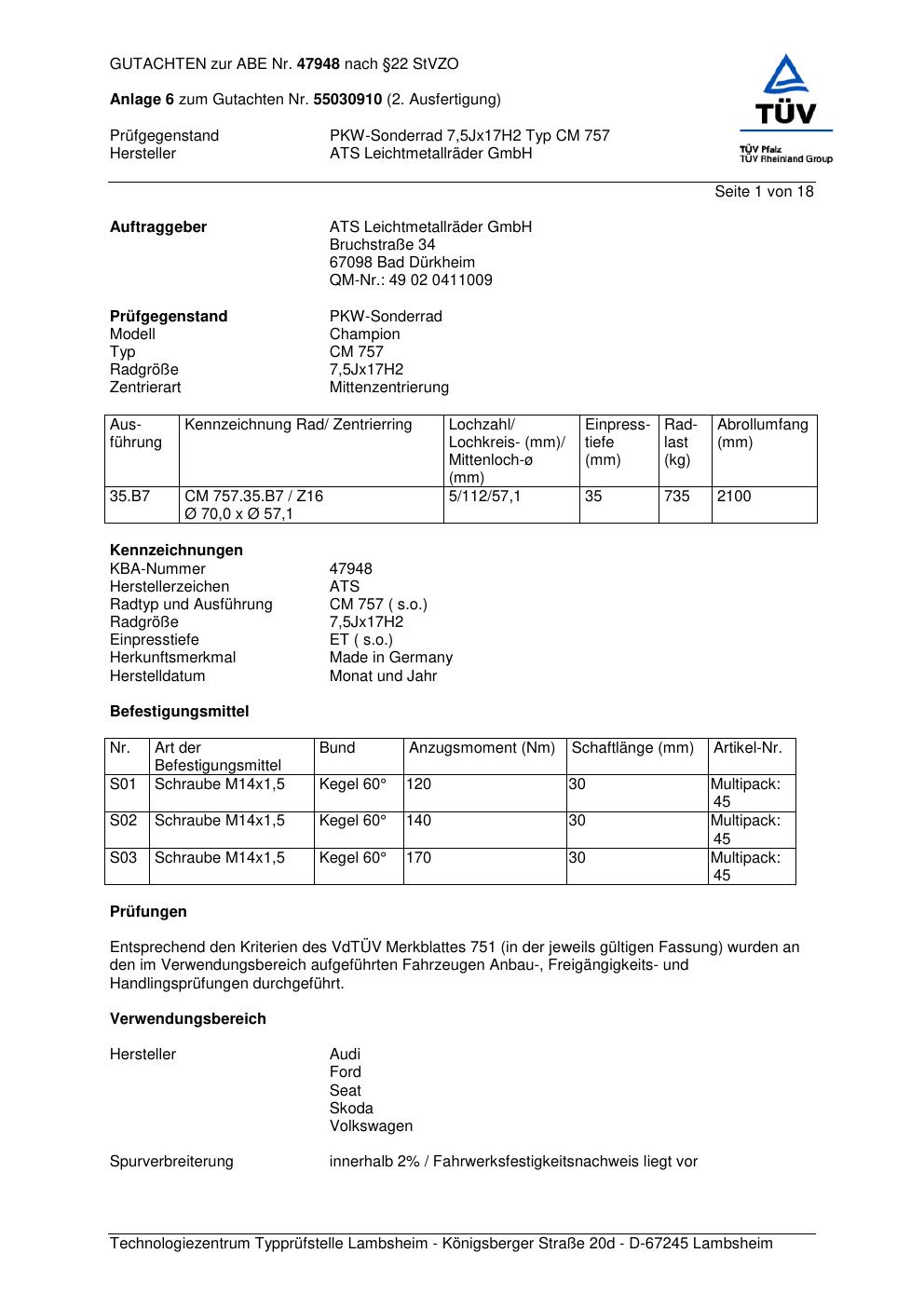 Dieses Gutachten (abe) bezieht sich auf die Alufelge ATS CM 757 in der Ausführung 7.5Jx17 ET 0, Mittenloch 0 mm (KBA 47948). Im PDF findest du typischerweise zulässige Reifengrößen, Auflagen/Anbauhinweise und – je nach Dokument – Hinweise zur Eintragung.