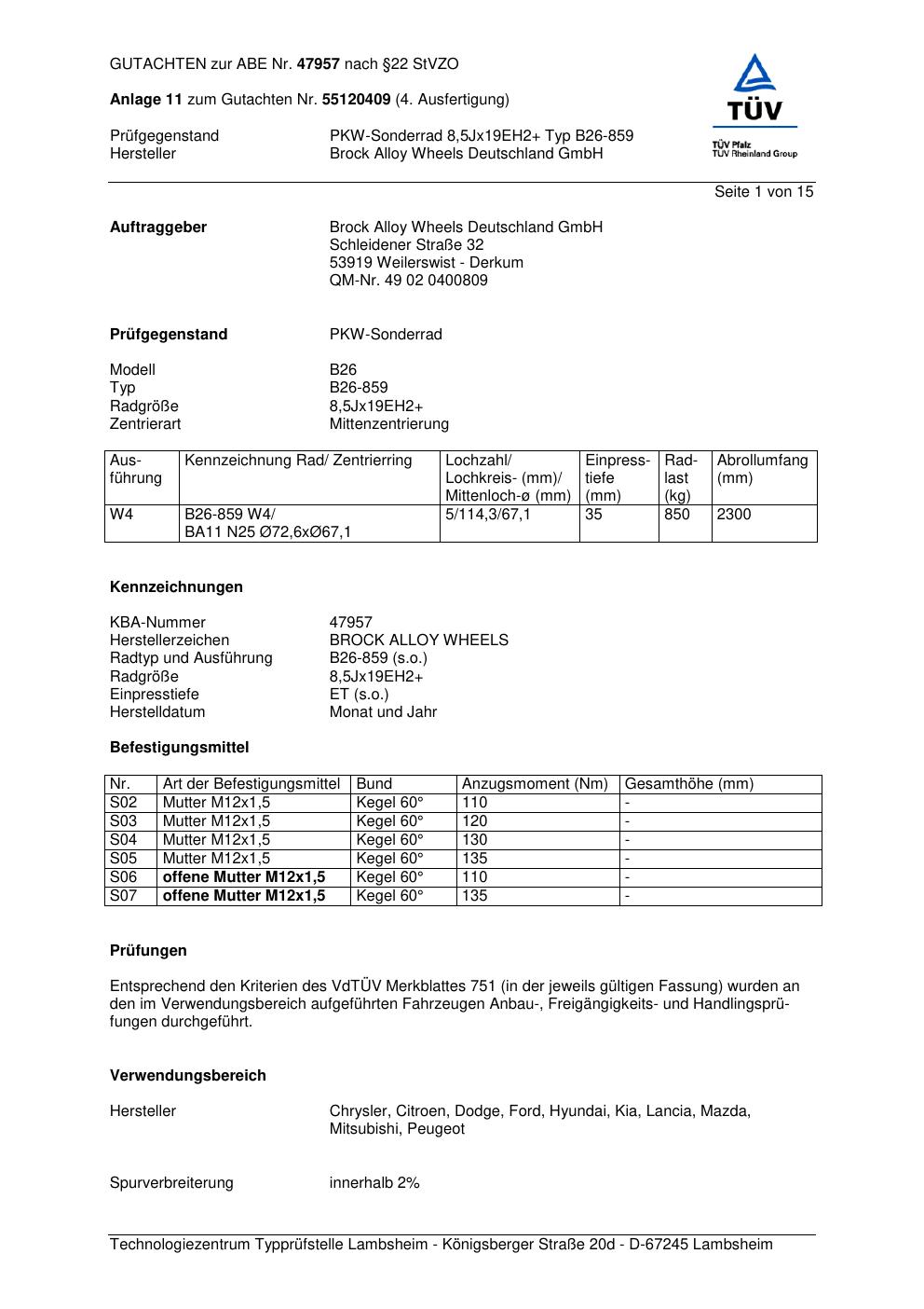 Dieses Gutachten (abe) bezieht sich auf die Alufelge Brock B26-85 9 in der Ausführung ET 0, Mittenloch 0 mm (KBA 47957). Im PDF findest du typischerweise zulässige Reifengrößen, Auflagen/Anbauhinweise und – je nach Dokument – Hinweise zur Eintragung.