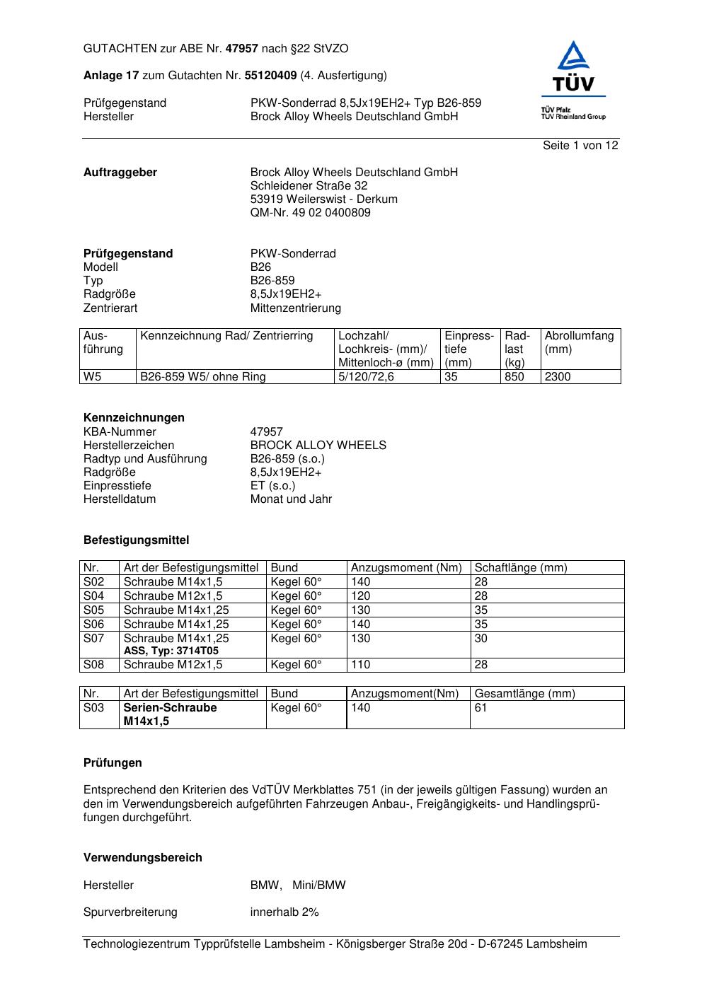 Dieses Gutachten (abe) bezieht sich auf die Alufelge Brock B26-85 9 in der Ausführung ET 0, Mittenloch 0 mm (KBA 47957). Im PDF findest du typischerweise zulässige Reifengrößen, Auflagen/Anbauhinweise und – je nach Dokument – Hinweise zur Eintragung.