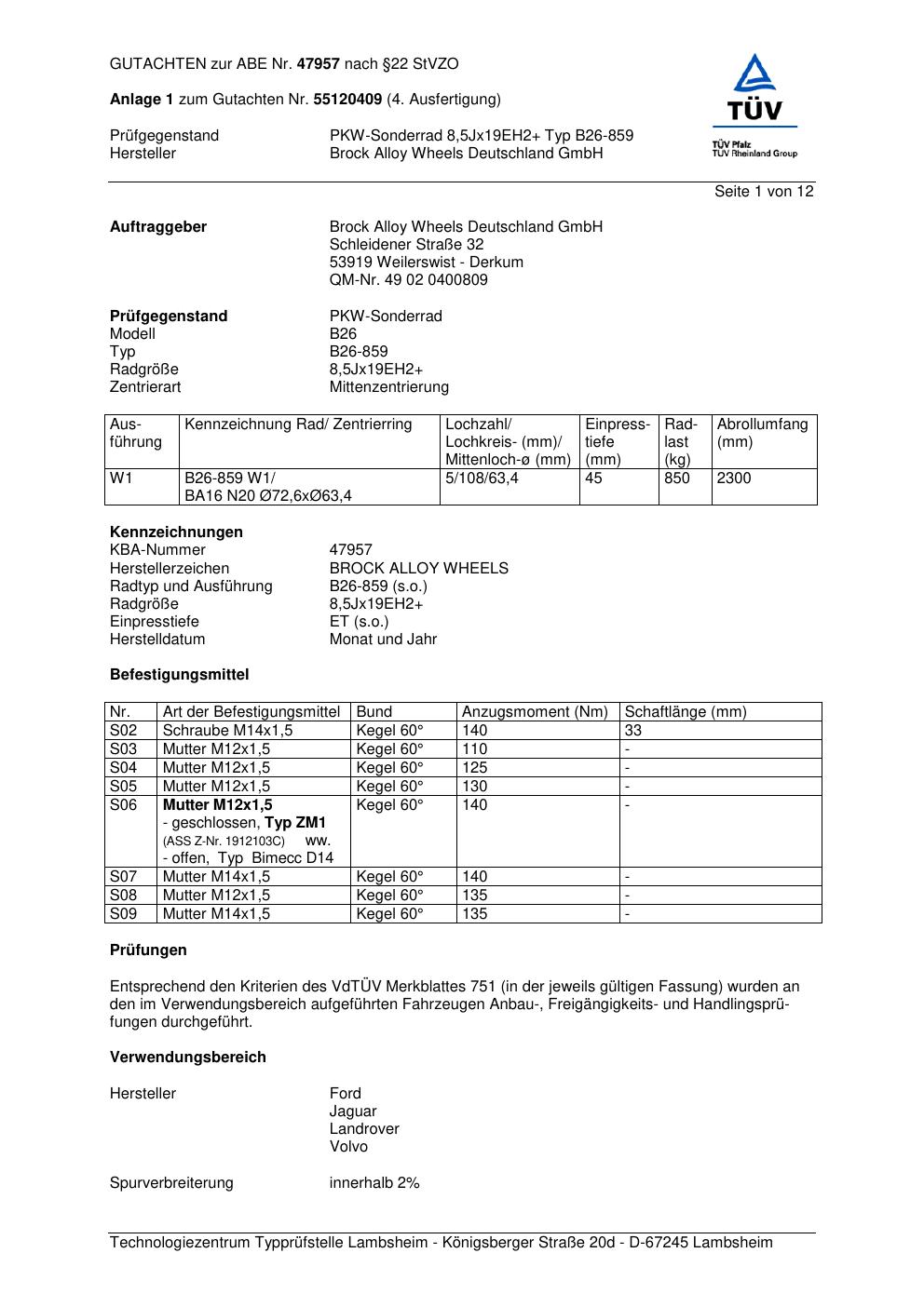 Dieses Gutachten (abe) bezieht sich auf die Alufelge Brock B26-85 9 in der Ausführung ET 0, Mittenloch 0 mm (KBA 47957). Im PDF findest du typischerweise zulässige Reifengrößen, Auflagen/Anbauhinweise und – je nach Dokument – Hinweise zur Eintragung.