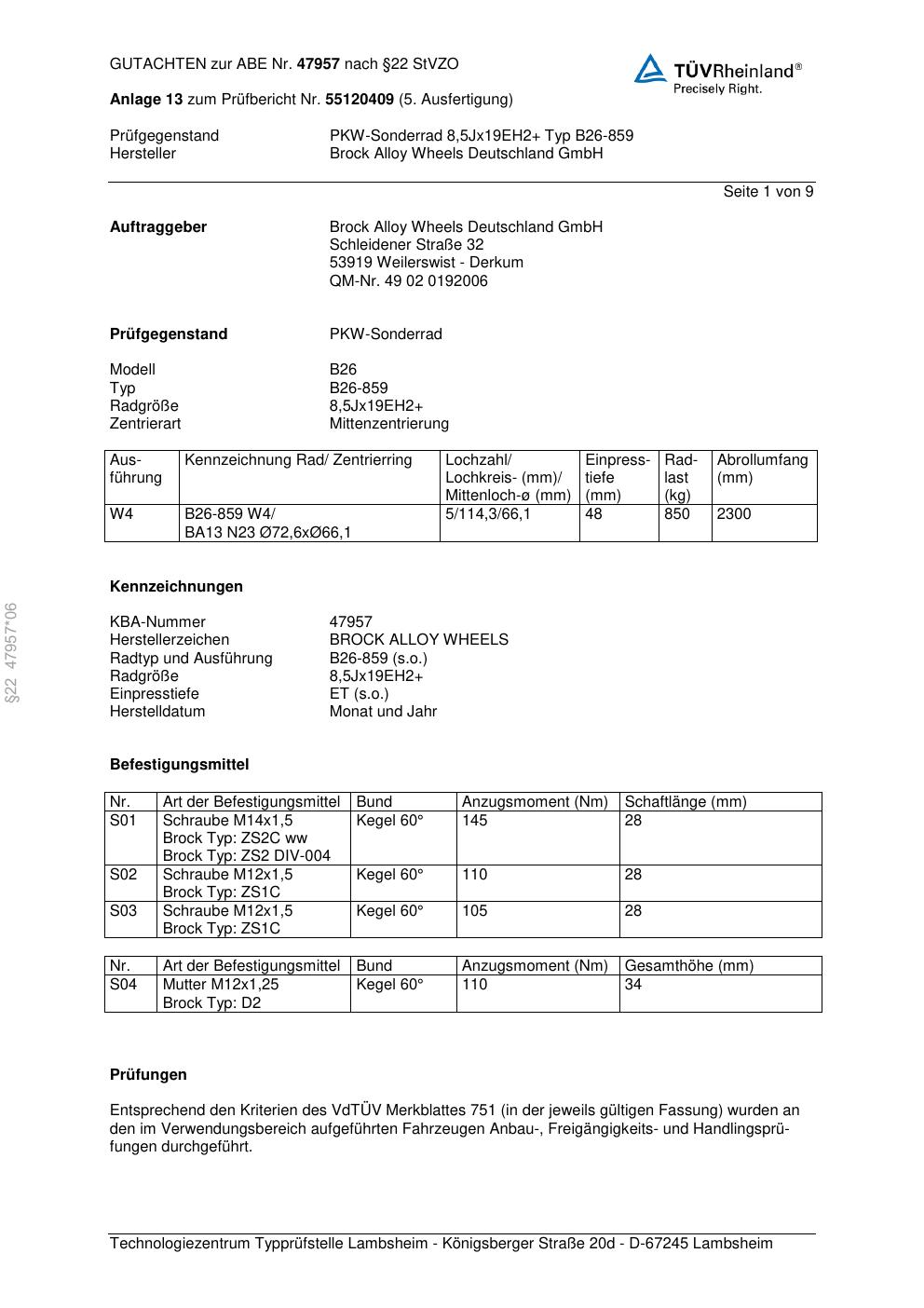 Dieses Gutachten (abe) bezieht sich auf die Alufelge Brock B26-85 9 in der Ausführung ET 0, Mittenloch 0 mm (KBA 47957). Im PDF findest du typischerweise zulässige Reifengrößen, Auflagen/Anbauhinweise und – je nach Dokument – Hinweise zur Eintragung.