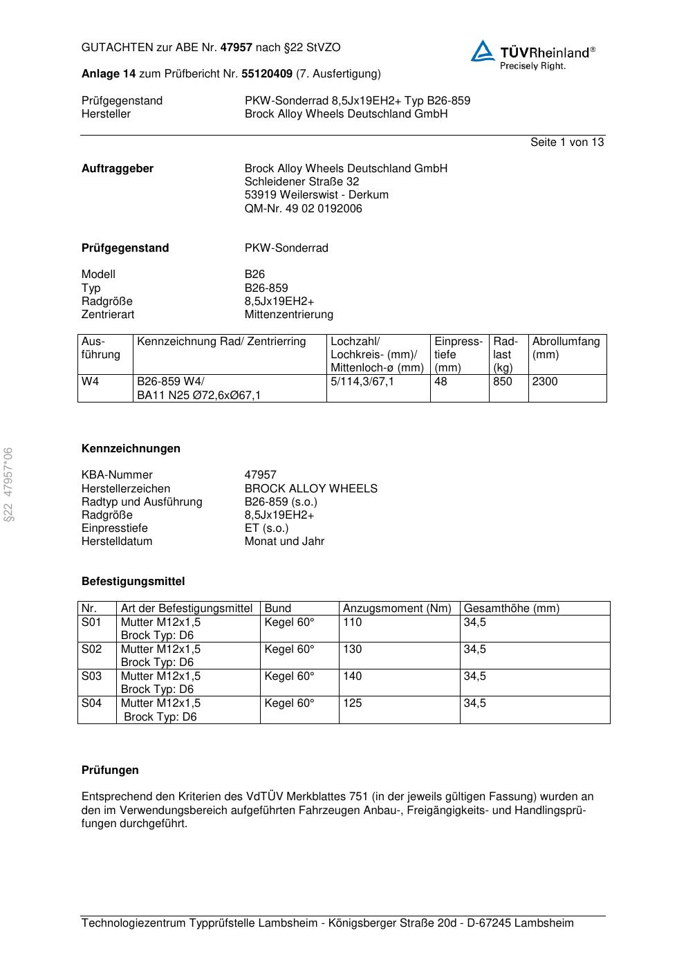 Dieses Gutachten (abe) bezieht sich auf die Alufelge Brock B26-85 9 in der Ausführung ET 0, Mittenloch 0 mm (KBA 47957). Im PDF findest du typischerweise zulässige Reifengrößen, Auflagen/Anbauhinweise und – je nach Dokument – Hinweise zur Eintragung.