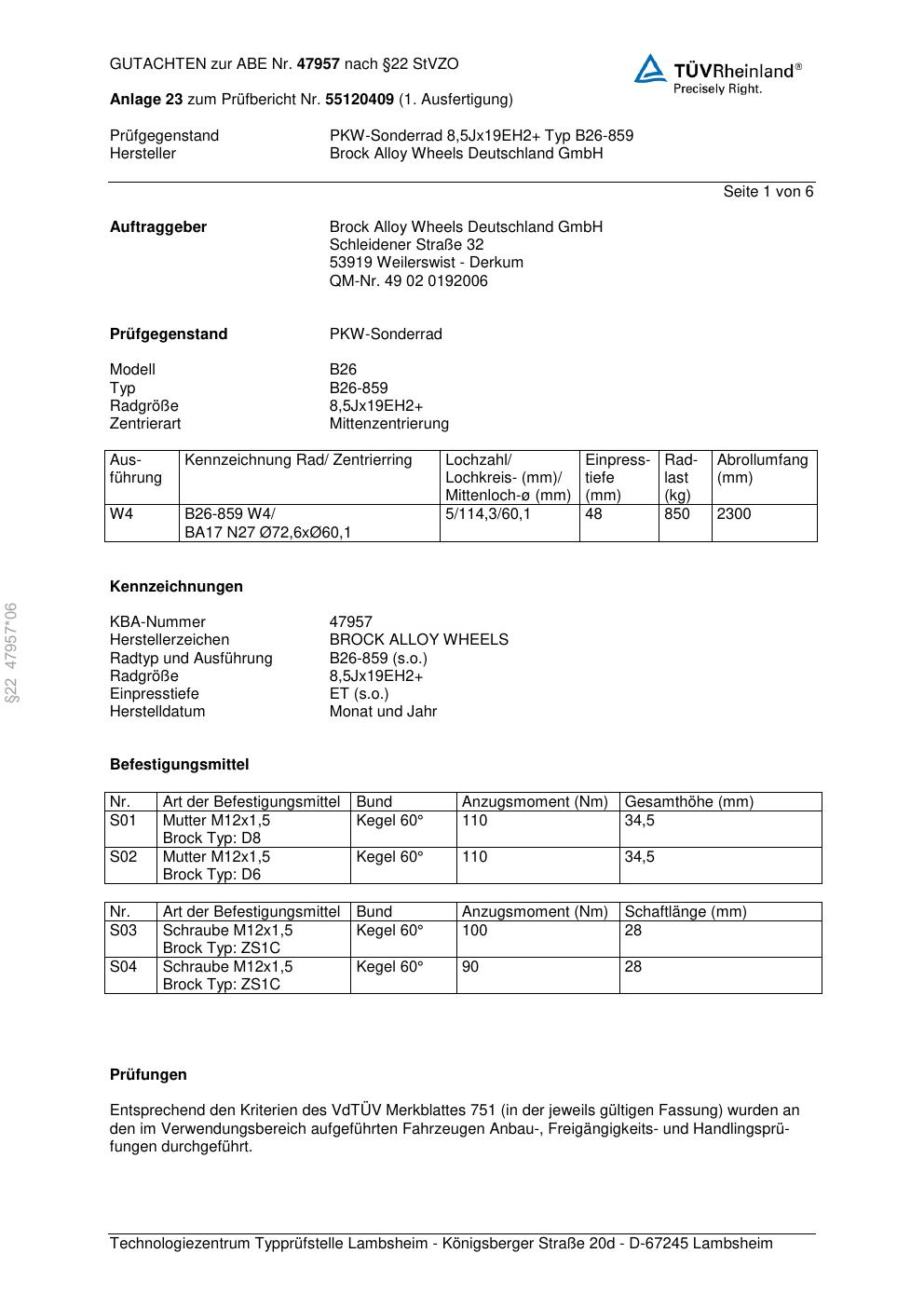 Dieses Gutachten (abe) bezieht sich auf die Alufelge Brock B26-85 9 in der Ausführung ET 0, Mittenloch 0 mm (KBA 47957). Im PDF findest du typischerweise zulässige Reifengrößen, Auflagen/Anbauhinweise und – je nach Dokument – Hinweise zur Eintragung.