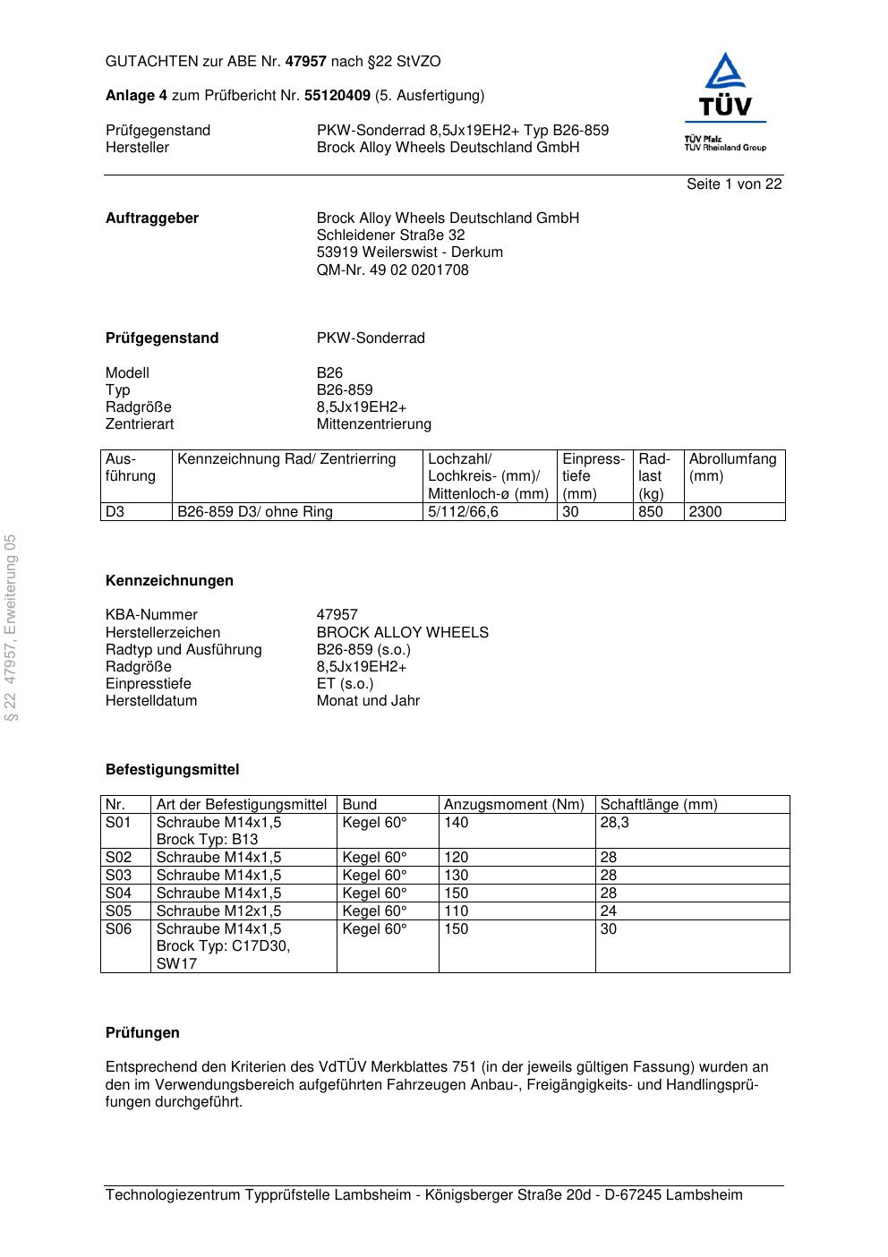 Dieses Gutachten (abe) bezieht sich auf die Alufelge Brock B26-85 9 in der Ausführung ET 0, Mittenloch 0 mm (KBA 47957). Im PDF findest du typischerweise zulässige Reifengrößen, Auflagen/Anbauhinweise und – je nach Dokument – Hinweise zur Eintragung.