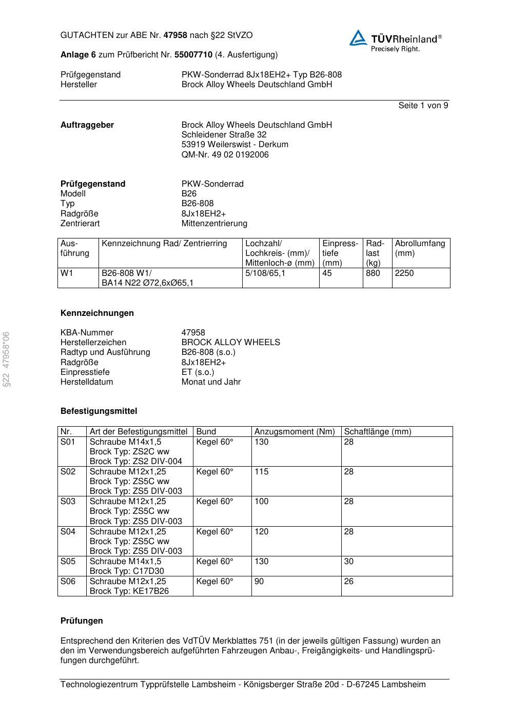 Dieses Gutachten (abe) bezieht sich auf die Alufelge Brock B26-808 in der Ausführung ET 0, Mittenloch 0 mm (KBA 47958). Im PDF findest du typischerweise zulässige Reifengrößen, Auflagen/Anbauhinweise und – je nach Dokument – Hinweise zur Eintragung.