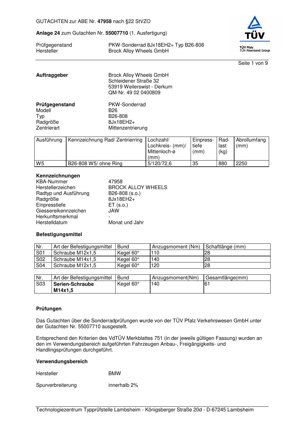 Dieses Gutachten (abe) bezieht sich auf die Alufelge Brock B26-808 in der Ausführung 5Jx83 ET 0, Mittenloch 0 mm (KBA 47958). Im PDF findest du typischerweise zulässige Reifengrößen, Auflagen/Anbauhinweise und – je nach Dokument – Hinweise zur Eintragung.