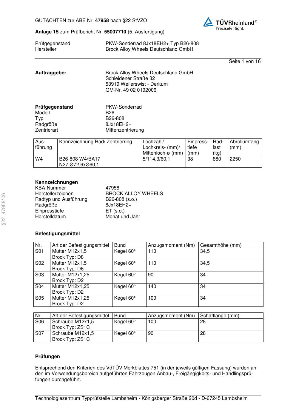 Dieses Gutachten (abe) bezieht sich auf die Alufelge Brock B26-808 in der Ausführung ET 0, Mittenloch 0 mm (KBA 47958). Im PDF findest du typischerweise zulässige Reifengrößen, Auflagen/Anbauhinweise und – je nach Dokument – Hinweise zur Eintragung.