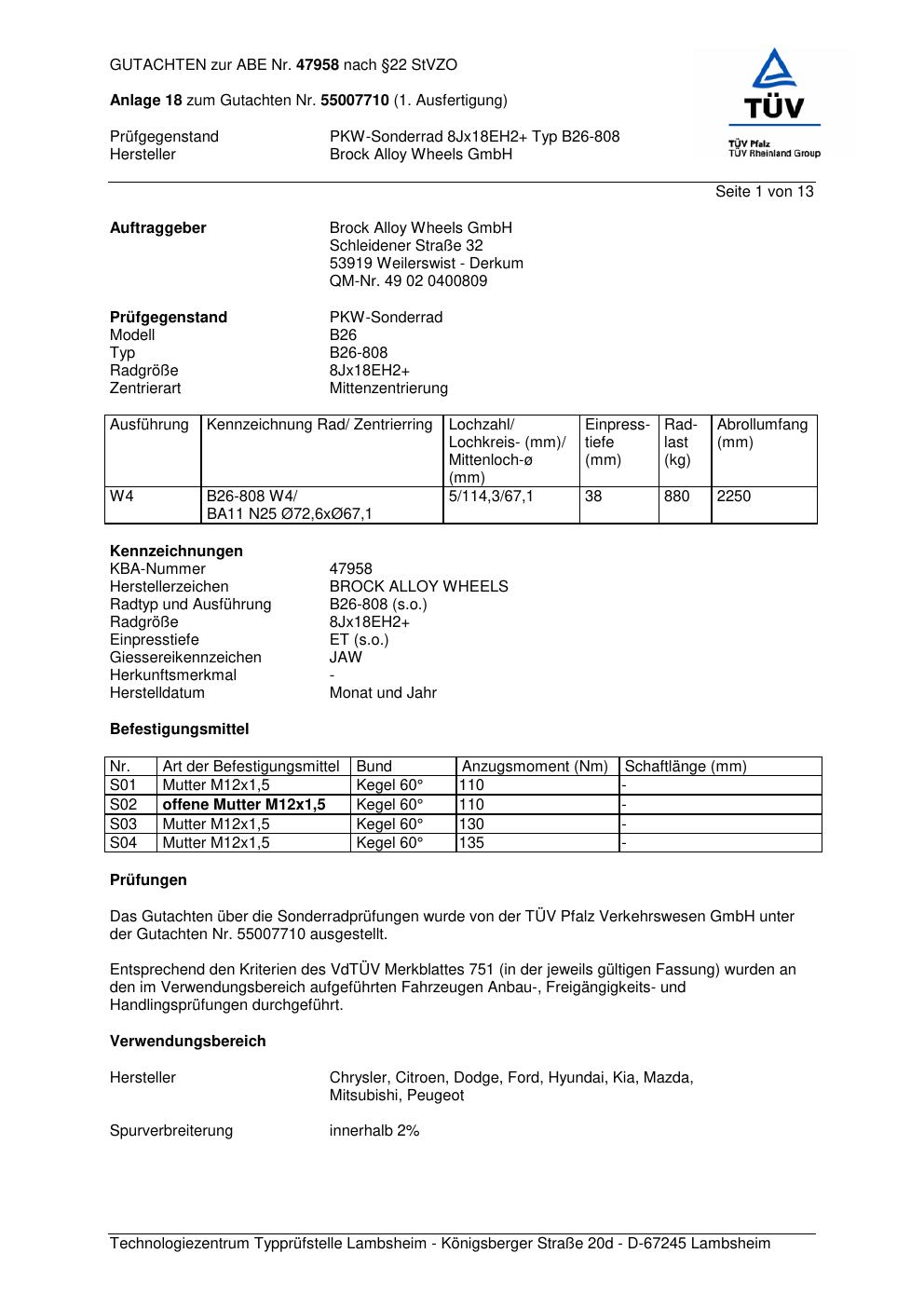 Dieses Gutachten (abe) bezieht sich auf die Alufelge Brock B26-808 in der Ausführung ET 0, Mittenloch 0 mm (KBA 47958). Im PDF findest du typischerweise zulässige Reifengrößen, Auflagen/Anbauhinweise und – je nach Dokument – Hinweise zur Eintragung.