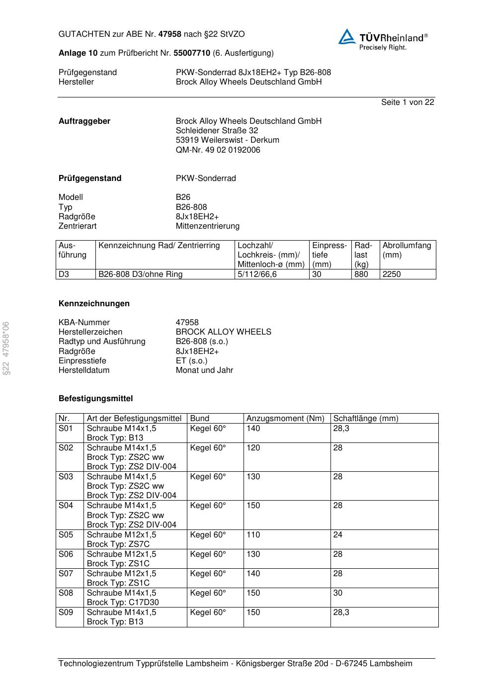 Dieses Gutachten (abe) bezieht sich auf die Alufelge Brock B26-808 in der Ausführung ET 0, Mittenloch 0 mm (KBA 47958). Im PDF findest du typischerweise zulässige Reifengrößen, Auflagen/Anbauhinweise und – je nach Dokument – Hinweise zur Eintragung.