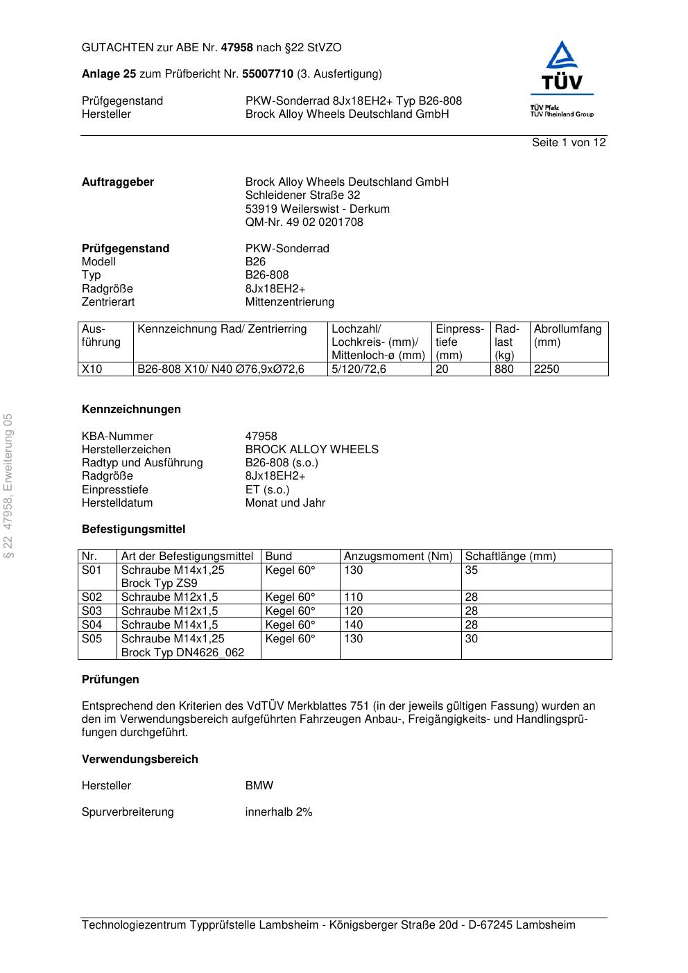 Dieses Gutachten (abe) bezieht sich auf die Alufelge Brock B26-808 in der Ausführung ET 0, Mittenloch 0 mm (KBA 47958). Im PDF findest du typischerweise zulässige Reifengrößen, Auflagen/Anbauhinweise und – je nach Dokument – Hinweise zur Eintragung.