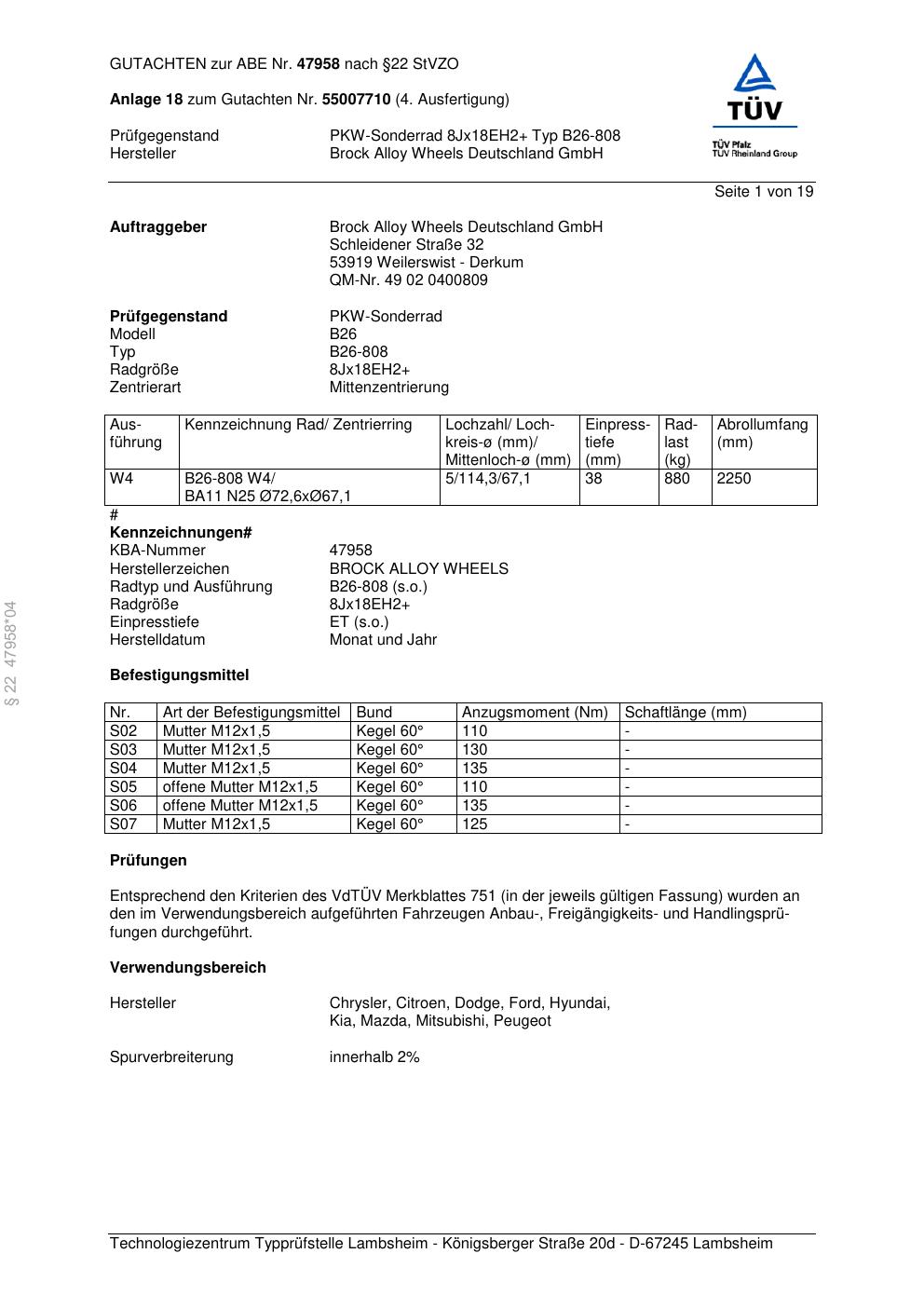 Dieses Gutachten (abe) bezieht sich auf die Alufelge Brock B26-808 in der Ausführung ET 0, Mittenloch 0 mm (KBA 47958). Im PDF findest du typischerweise zulässige Reifengrößen, Auflagen/Anbauhinweise und – je nach Dokument – Hinweise zur Eintragung.