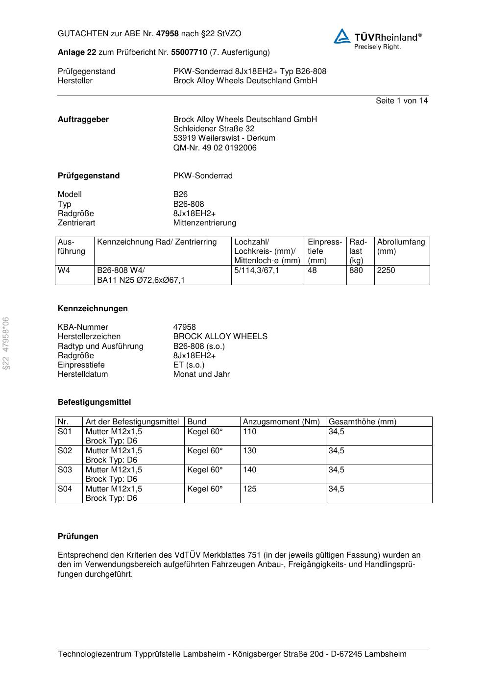 Dieses Gutachten (abe) bezieht sich auf die Alufelge Brock B26-808 in der Ausführung ET 0, Mittenloch 0 mm (KBA 47958). Im PDF findest du typischerweise zulässige Reifengrößen, Auflagen/Anbauhinweise und – je nach Dokument – Hinweise zur Eintragung.