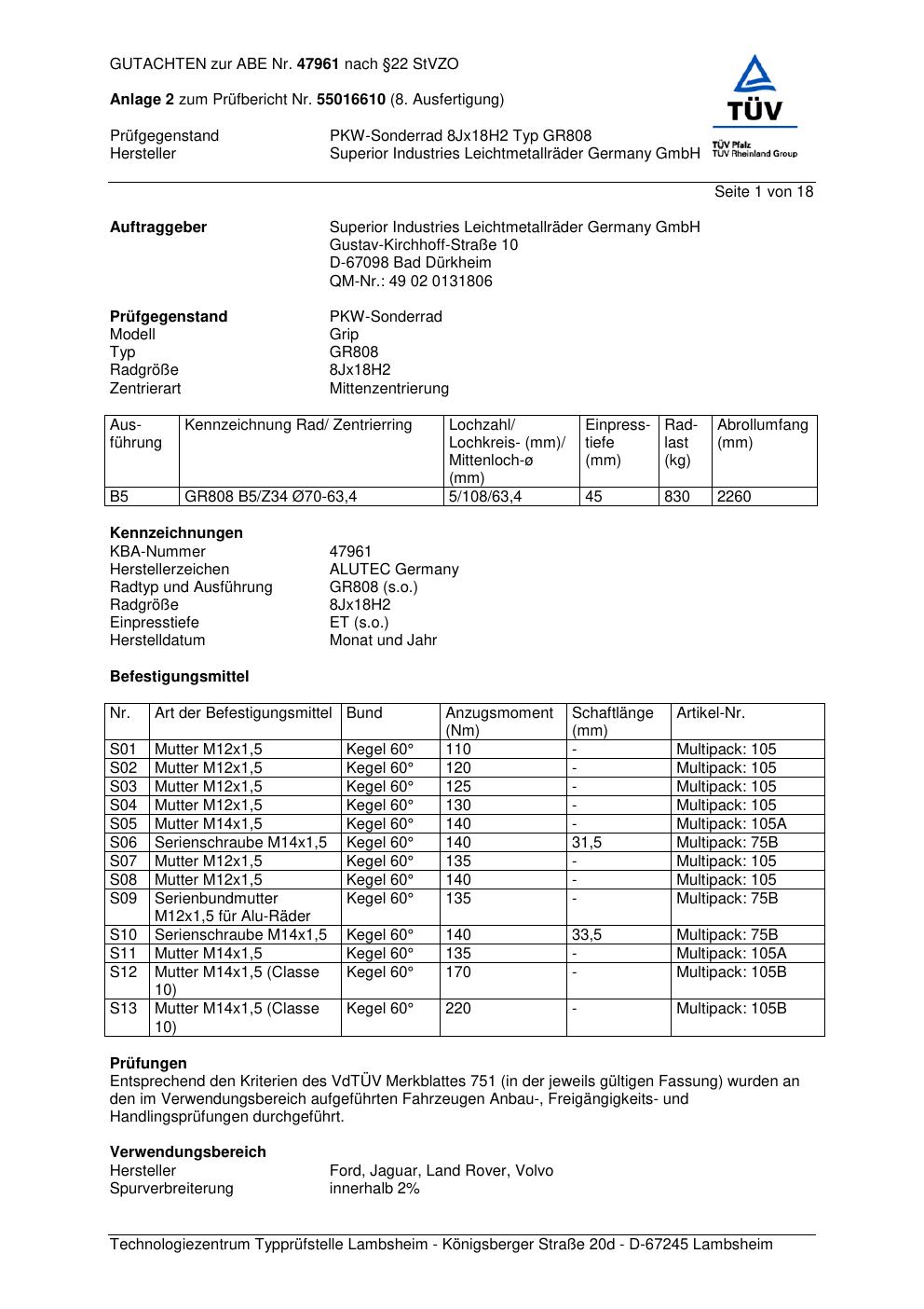 Dieses Gutachten (abe) bezieht sich auf die Alufelge ALUTEC GR808 in der Ausführung 8Jx18 ET 0, Mittenloch 0 mm (KBA 47961). Im PDF findest du typischerweise zulässige Reifengrößen, Auflagen/Anbauhinweise und – je nach Dokument – Hinweise zur Eintragung.