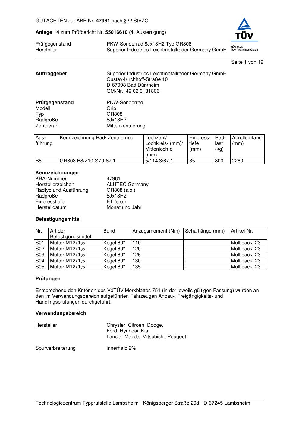 Dieses Gutachten (abe) bezieht sich auf die Alufelge ALUTEC GR808 in der Ausführung 8Jx18 ET 0, Mittenloch 0 mm (KBA 47961). Im PDF findest du typischerweise zulässige Reifengrößen, Auflagen/Anbauhinweise und – je nach Dokument – Hinweise zur Eintragung.