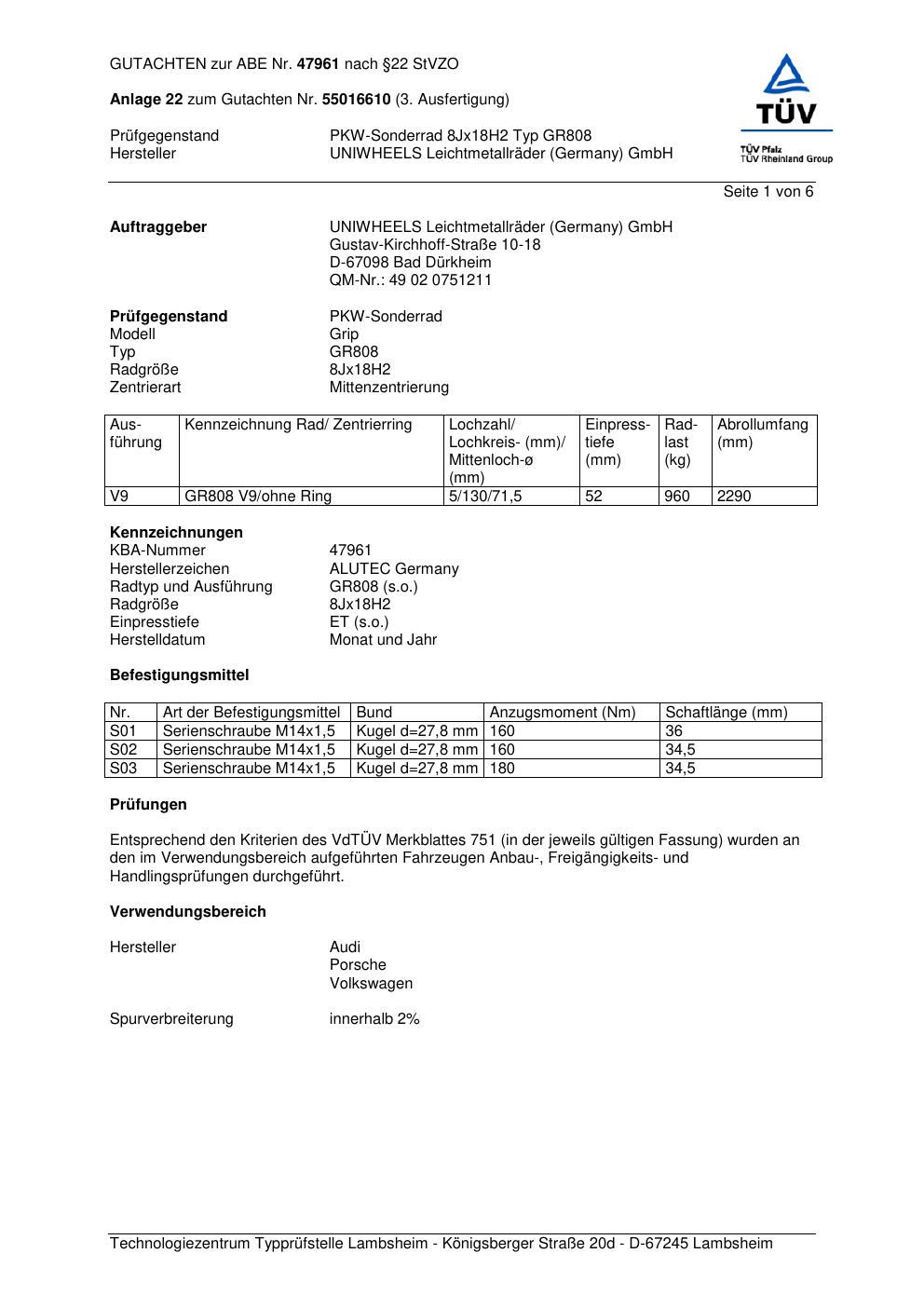 Dieses Gutachten (abe) bezieht sich auf die Alufelge ALUTEC GR808 in der Ausführung 8Jx18 ET 0, Mittenloch 0 mm (KBA 47961). Im PDF findest du typischerweise zulässige Reifengrößen, Auflagen/Anbauhinweise und – je nach Dokument – Hinweise zur Eintragung.