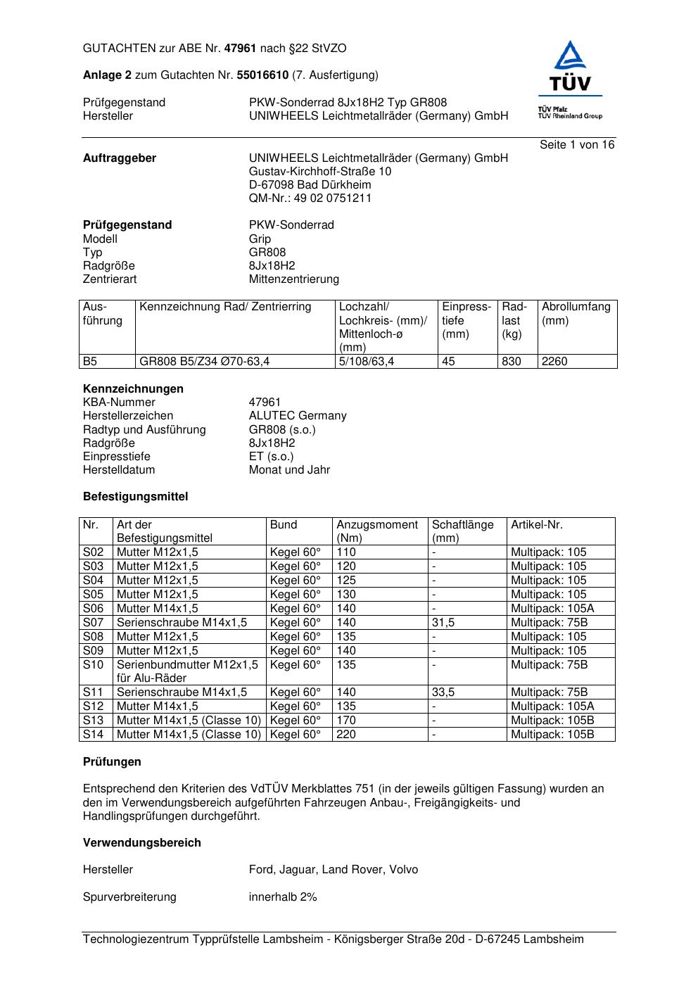 Felgengutachten / abe für Alufelgen ALUTEC GR808 (8Jx18 ET 0, Mittenloch 0 mm) mit KBA 47961 (Zertifikatsnummer 47961). Hier kostenlos als PDF herunterladen. Der Download-Link ist 24 Stunden gültig und kann bis zu zwei Mal verwendet werden.