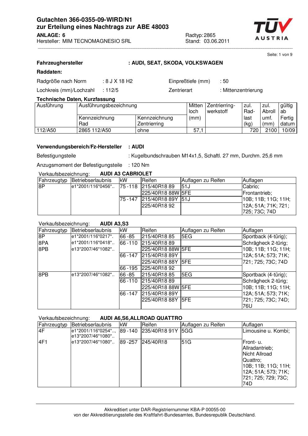 Diese Allgemeine Betriebserlaubnis (ABE) bezieht sich auf die Felge ATS 2865 in der Ausführung 8Jx18 ET0 mit der KBA 48003. Eine ABE ist eine bauartspezifische Genehmigung, die der Hersteller beim Kraftfahrt-Bundesamt (KBA) erwirkt hat. Sie erlaubt die Verwendung der Felge an den im Dokument genannten Fahrzeugen ohne zusätzliche Einzelabnahme, solange sämtliche im Gutachten aufgeführten Auflagen eingehalten werden.