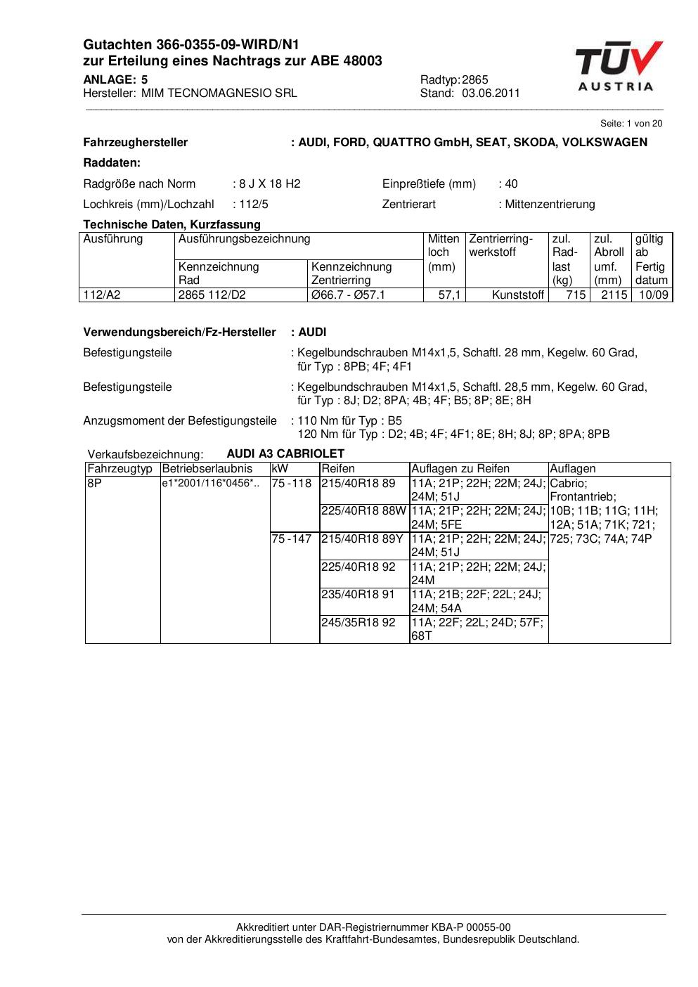Diese Allgemeine Betriebserlaubnis (ABE) bezieht sich auf die Felge ATS 2865 in der Ausführung 8Jx18 ET0 mit der KBA 48003. Eine ABE ist eine bauartspezifische Genehmigung, die der Hersteller beim Kraftfahrt-Bundesamt (KBA) erwirkt hat. Sie erlaubt die Verwendung der Felge an den im Dokument genannten Fahrzeugen ohne zusätzliche Einzelabnahme, solange sämtliche im Gutachten aufgeführten Auflagen eingehalten werden.