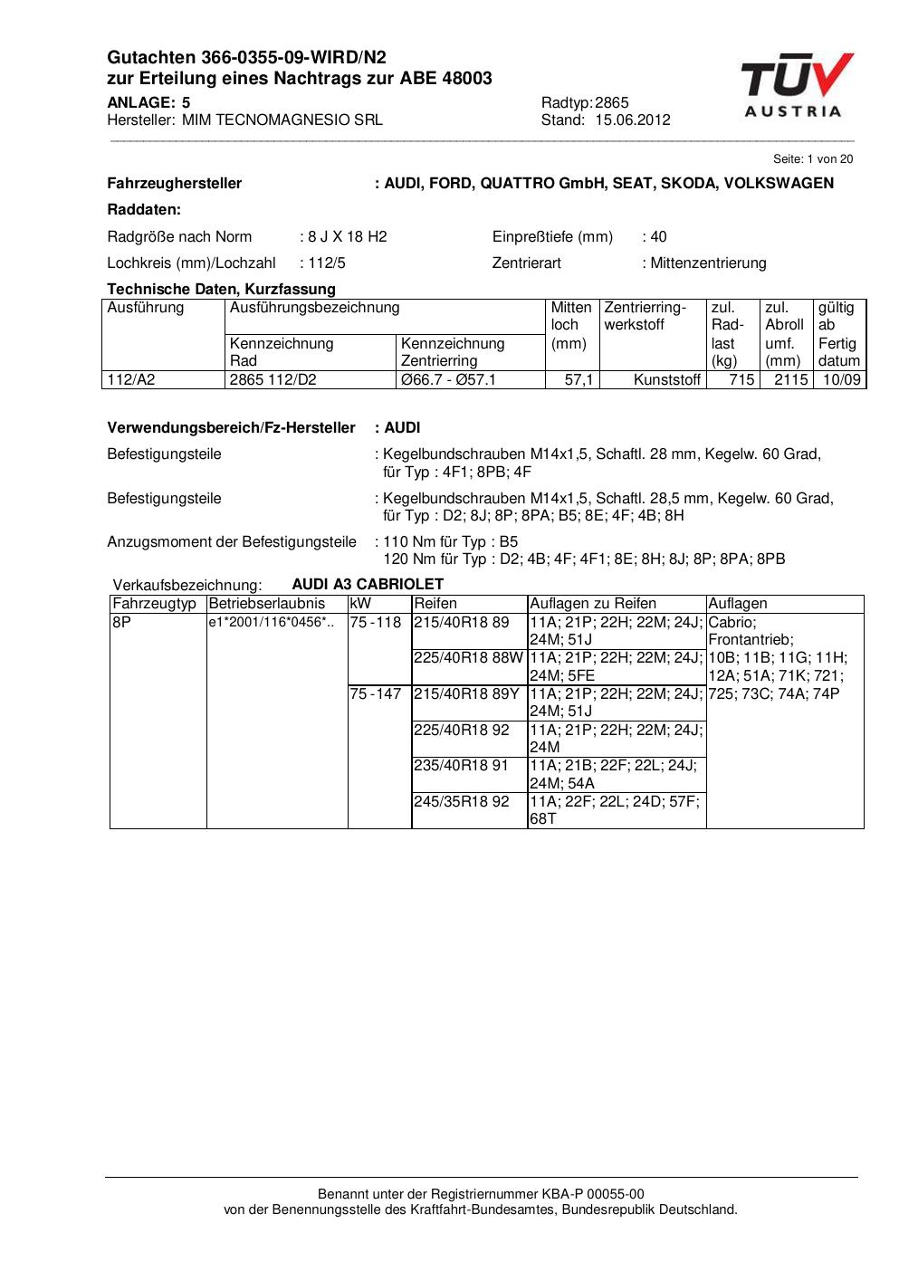 Diese Allgemeine Betriebserlaubnis (ABE) bezieht sich auf die Felge ATS 2865 in der Ausführung 8Jx18 ET0 mit der KBA 48003. Eine ABE ist eine bauartspezifische Genehmigung, die der Hersteller beim Kraftfahrt-Bundesamt (KBA) erwirkt hat. Sie erlaubt die Verwendung der Felge an den im Dokument genannten Fahrzeugen ohne zusätzliche Einzelabnahme, solange sämtliche im Gutachten aufgeführten Auflagen eingehalten werden.