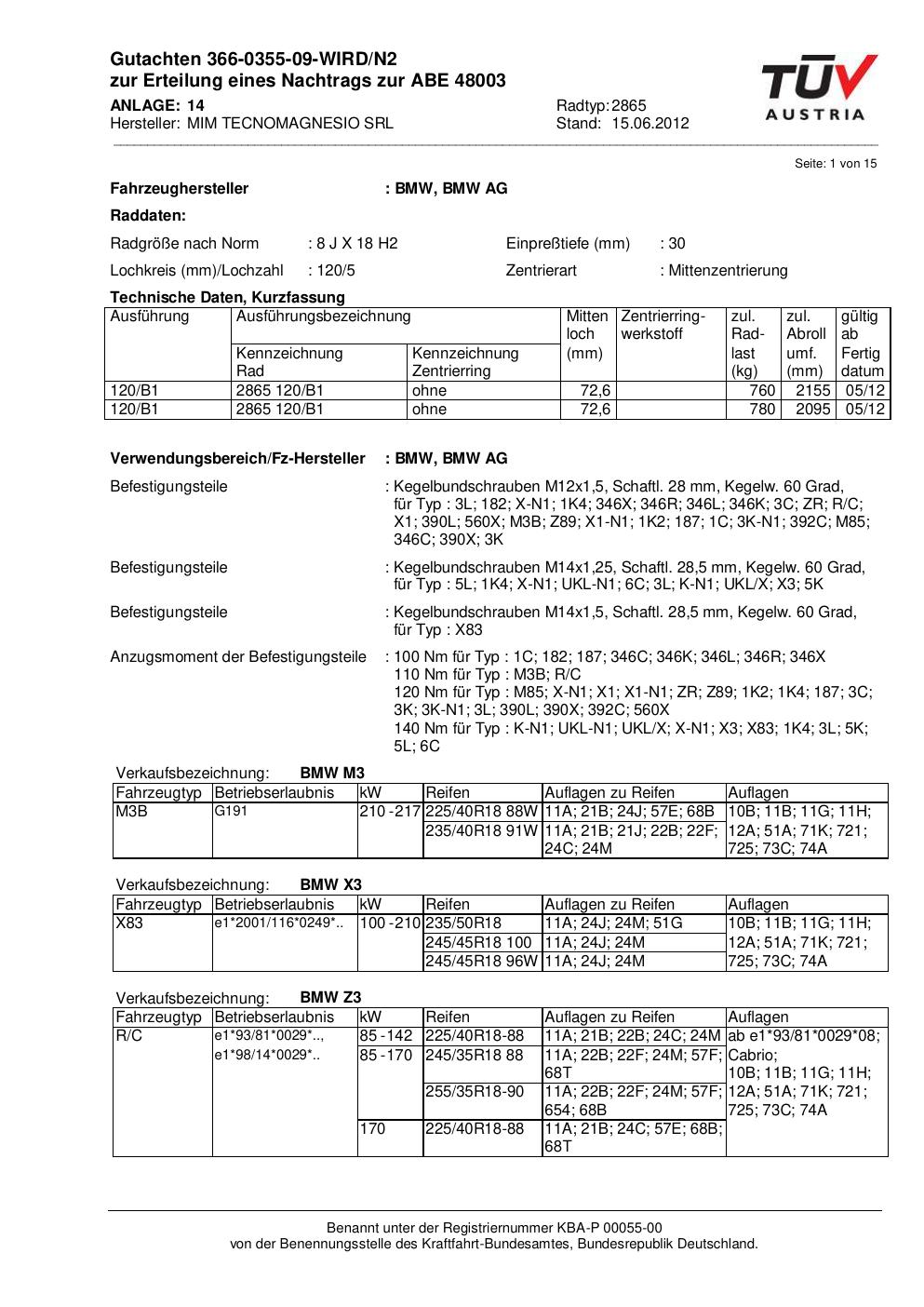 Diese Allgemeine Betriebserlaubnis (ABE) bezieht sich auf die Felge ATS 2865 in der Ausführung 8Jx18 ET0 mit der KBA 48003. Eine ABE ist eine bauartspezifische Genehmigung, die der Hersteller beim Kraftfahrt-Bundesamt (KBA) erwirkt hat. Sie erlaubt die Verwendung der Felge an den im Dokument genannten Fahrzeugen ohne zusätzliche Einzelabnahme, solange sämtliche im Gutachten aufgeführten Auflagen eingehalten werden.