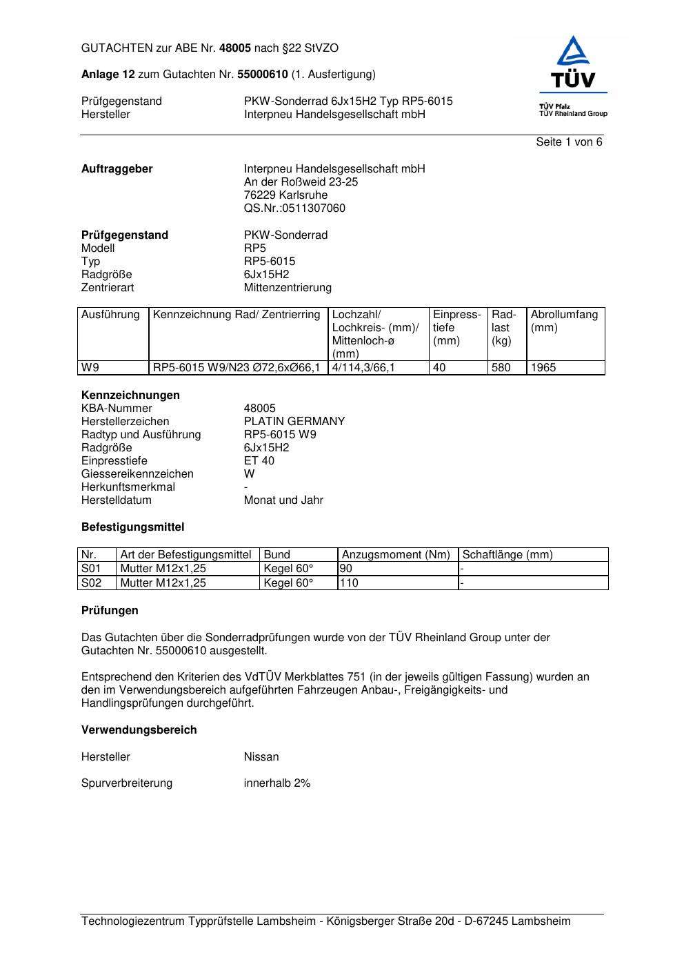 Dieses Gutachten (abe) bezieht sich auf die Alufelge Platin RP5-6015 in der Ausführung 6Jx15 ET 0, Mittenloch 0 mm (KBA 48005). Im PDF findest du typischerweise zulässige Reifengrößen, Auflagen/Anbauhinweise und – je nach Dokument – Hinweise zur Eintragung.